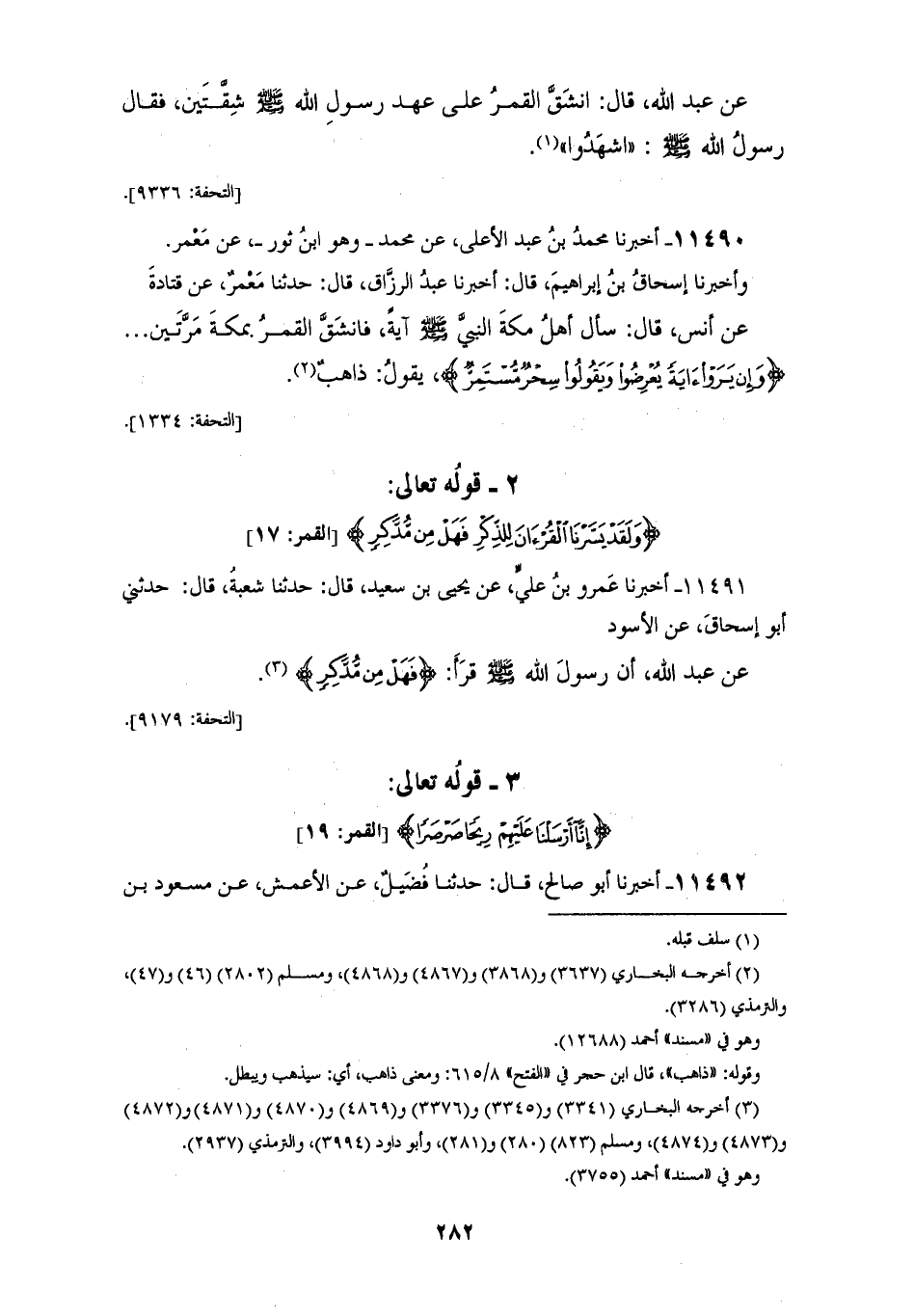 11490 - أَخْبَرَنَا مُحَمَّدُ بْنُ عَبْدِ الْأَعْلَى، عَنْ مُحَمَّدٍ وَهُوَ ابْنُ ثَوْرٍ، عَنْ مَعْمَرٍ، وَأَخْبَرَنَا إِسْحَاقُ بْنُ إِبْرَاهِيمَ، قَالَ: أَخْبَرَنَا عَبْدُ الرَّزَّاقِ، قَالَ: حَدَّثَنَا مَعْمَرٌ، عَنْ قَتَادَةَ، عَنْ أَنَسٍ، قَالَ: سَأَلَ أَهْلُ مَكَّةَ النَّبِيَّ صَلَّى اللهُ عَلَيْهِ وَسَلَّمَ آيَةً، §فَانْشَقَّ الْقَمَرُ بِمَكَّةَ مَرَّتَيْنِ {وَإِنْ يَرَوْا آيَةً يُعْرِضُوا وَيَقُولُوا سِحْرٌ مُسْتَمِرٌّ} [القمر: 2] , يَقُولُ: ذَاهِبٌ