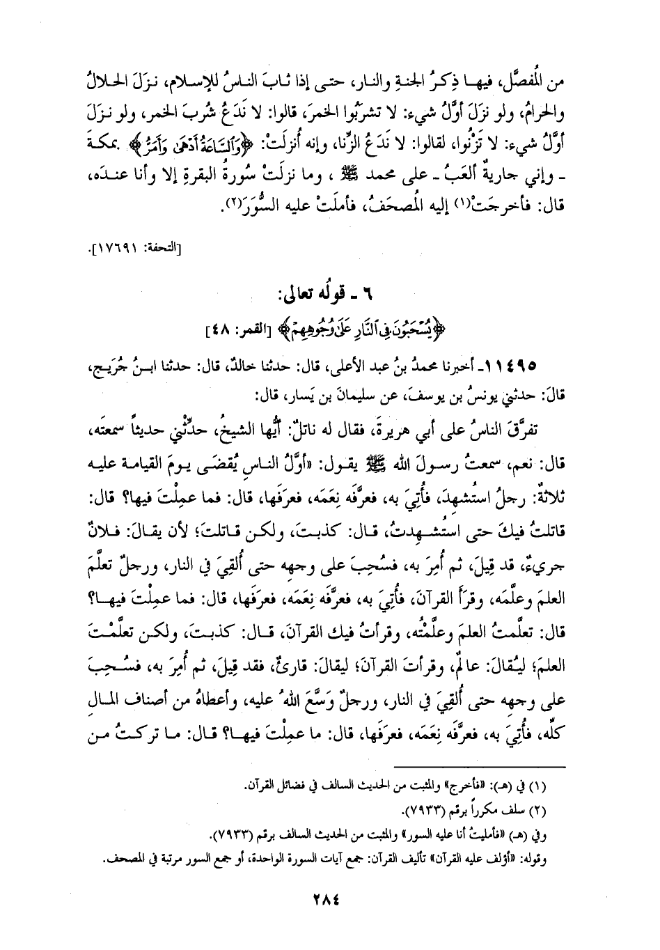 11495 - أَخْبَرَنَا مُحَمَّدُ بْنُ عَبْدِ الْأَعْلَى، قَالَ: حَدَّثَنَا خَالِدٌ، قَالَ: حَدَّثَنَا ابْنُ جُرَيْجٍ، قَالَ: حَدَّثَنِي يُونُسُ بْنُ يُوسُفَ، عَنْ سُلَيْمَانَ بْنِ يَسَارٍ، قَالَ: تَفَرَّقَ النَّاسُ عَلَى أَبِي هُرَيْرَةَ، فَقَالَ لَهُ نَاتِلٌ: أَيُّهَا الشَّيْخُ، حَدِّثْنِي حَدِيثًا سَمِعْتَهُ، قَالَ: نَعَمْ، سَمِعْتُ رَسُولَ اللهِ صَلَّى اللهُ عَلَيْهِ وَسَلَّمَ يَقُولُ: " أَوَّلُ النَّاسِ يُقْضَى يَوْمَ الْقِيَامَةِ عَلَيْهِ ثَلَاثَةٌ: §رَجُلٌ اسْتُشْهِدَ فَأُتِيَ بِهِ فَعَرَّفَهُ نِعَمَهُ فَعَرَفَهَا، قَالَ: فَمَا عَمِلْتَ فِيهَا؟ , قَالَ: قَاتَلْتُ فِيكَ حَتَّى اسْتُشْهِدْتُ، قَالَ: كَذَبْتَ، وَلَكِنْ قَاتَلْتَ لَأَنْ يُقَالَ: فُلَانٌ جَرِيءٌ، قَدْ قِيلَ، ثُمَّ أُمِرَ بِهِ فَسُحِبَ عَلَى وَجْهِهِ , حَتَّى أُلْقِيَ فِي النَّارِ، وَرَجُلٌ تَعَلَّمَ الْعِلْمَ وَعَلَّمَهُ، وَقَرَأَ الْقُرْآنَ، فَأُتِيَ بِهِ فَعَرَّفَهُ نِعَمَهُ فَعَرَفَهَا، قَالَ: فَمَا عَمِلْتَ فِيهَا؟ , قَالَ: تَعَلَّمْتُ الْعِلْمَ وَعَلَّمْتُهُ، وَقَرَأْتُ فِيكَ الْقُرْآنَ، قَالَ: كَذَبْتَ، وَلَكِنْ تَعَلَّمْتَ الْعِلْمَ لِيُقَالَ: عَالِمٌ، وَقَرَأْتَ الْقُرْآنَ لِيُقَالَ: قَارِئٌ، فَقَدْ قِيلَ، ثُمَّ أُمِرَ بِهِ فَسُحِبَ عَلَى وَجْهِهِ حَتَّى أُلْقِيَ فِي النَّارِ، وَرَجُلٌ وَسَّعَ اللهُ عَلَيْهِ وَأَعْطَاهُ مِنْ أَصْنَافِ الْمَالِ كُلِّهِ، فَأُتِيَ بِهِ فَعَرَّفَهُ نِعَمَهُ فَعَرَفَهَا، قَالَ: مَا عَمِلْتَ فِيهَا؟ , قَالَ: مَا تَرَكْتُ مِنْ سَبِيلٍ تُحِبُّ أَنْ يُنْفَقَ فِيهَا إِلَّا أَنْفَقْتُ فِيهَا لَكَ، قَالَ: كَذَبْتَ، وَلَكِنْ فَعَلْتَ لِيُقَالَ: جَوَادٌ، فَقَدْ قِيلَ، ثُمَّ أُمِرَ بِهِ فَسُحِبَ عَلَى وَجْهِهِ حَتَّى أُلْقِيَ فِي النَّارِ "