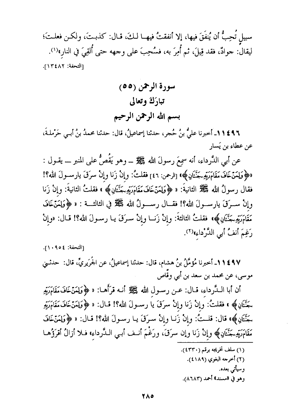 11497 - أَخْبَرَنَا مُؤَمَّلُ بْنُ هِشَامٍ، قَالَ: حَدَّثَنَا إِسْمَاعِيلُ، عَنِ الْجُرَيْرِيِّ، قَالَ: حَدَّثَنِي مُوسَى، عَنْ مُحَمَّدِ بْنِ سَعْدِ بْنِ أَبِي وَقَّاصٍ، أَنَّ أَبَا الدَّرْدَاءِ قَالَ عَنْ رَسُولِ اللهِ صَلَّى اللهُ عَلَيْهِ وَسَلَّمَ أَنَّهُ قَرَأَهَا: {§وَلِمَنْ خَافَ مَقَامَ رَبِّهِ جُنَّتَانِ} [الرحمن: 46] , فَقُلْتُ: وَإِنْ زَنَى وَإِنْ سَرَقَ يَا رَسُولَ اللهِ؟ , قَالَ: {وَلِمَنْ خَافَ مَقَامَ رَبِّهِ جُنَّتَانِ} [الرحمن: 46] , قَالَ: قُلْتُ: وَإِنْ زِنَى وَإِنْ سَرَقَ يَا رَسُولَ اللهِ؟ , قَالَ: {وَلِمَنْ خَافَ مَقَامَ رَبِّهِ جُنَّتَانِ} [الرحمن: 46]، وَإِنْ زِنَى وَإِنْ سَرَقَ، وَرَغِمَ أَنْفُ أَبِي الدَّرْدَاءِ " , فَلَا أَزَالُ أَقْرَؤُهَا كَذَلِكَ حَتَّى أَلْقَاهُ