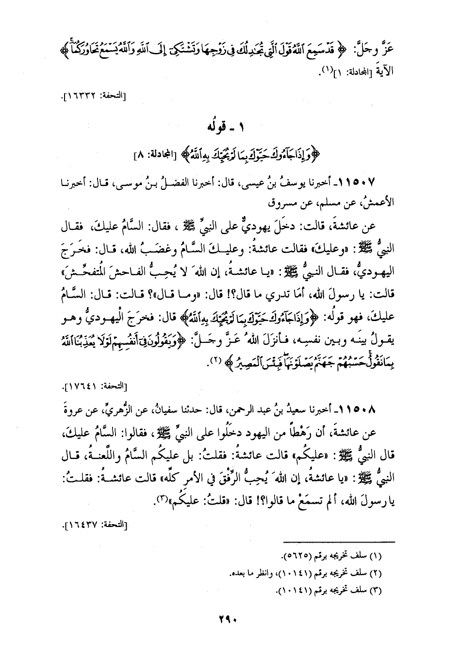 11507 - أَخْبَرَنَا يُوسُفُ بْنُ عِيسَى، قَالَ: أَخْبَرَنَا الْفَضْلُ بْنُ مُوسَى، قَالَ: أَخْبَرَنَا الْأَعْمَشُ، عَنْ مُسْلِمٍ، عَنْ مَسْرُوقٍ، عَنْ عَائِشَةَ، قَالَتْ: دَخَلَ يَهُودِيٌّ عَلَى النَّبِيِّ صَلَّى اللهُ عَلَيْهِ وَسَلَّمَ فَقَالَ: السَّامُ عَلَيْكَ، فَقَالَ النَّبِيُّ صَلَّى اللهُ عَلَيْهِ وَسَلَّمَ: «وَعَلَيْكَ» , فَقَالَتْ عَائِشَةُ: وَعَلَيْكَ السَّامُ وَغَضَبُ اللهِ، قَالَ: فَخَرَجَ الْيَهُودِيُّ، فَقَالَ النَّبِيُّ صَلَّى اللهُ عَلَيْهِ وَسَلَّمَ: «يَا عَائِشَةُ، إِنَّ اللهَ لَا يُحِبُّ الْفَاحِشَ الْمُتَفَحِّشَ» , قَالَتْ: يَا رَسُولَ اللهِ، أَمَّا تَدْرِي مَا قَالَ؟ , قَالَ: «وَمَا قَالَ؟» , قَالَتْ: قَالَ: السَّامُ عَلَيْكَ , فَهُوَ قَوْلِهِ: {§وَإِذَا جَاءُوكَ حَيَّوْكَ بِمَا لَمْ يُحَيِّكَ بِهِ اللهُ}، قَالَ: فَخَرَجَ الْيَهُودِيُّ وَهُوَ يَقُولُ بَيْنَهُ وَبَيْنَ نَفْسِهِ، , فَأَنْزَلَ اللهُ عَزَّ وَجَلَّ {وَيَقُولُونَ فِي أَنْفُسِهِمْ لَوْلَا يُعَذِّبُنَا اللهُ بِمَا نَقُولُ حَسْبُهُمْ جَهَنَّمُ يَصْلَونَهَا فَبِئْسَ الْمَصِيرُ} [المجادلة: 8]