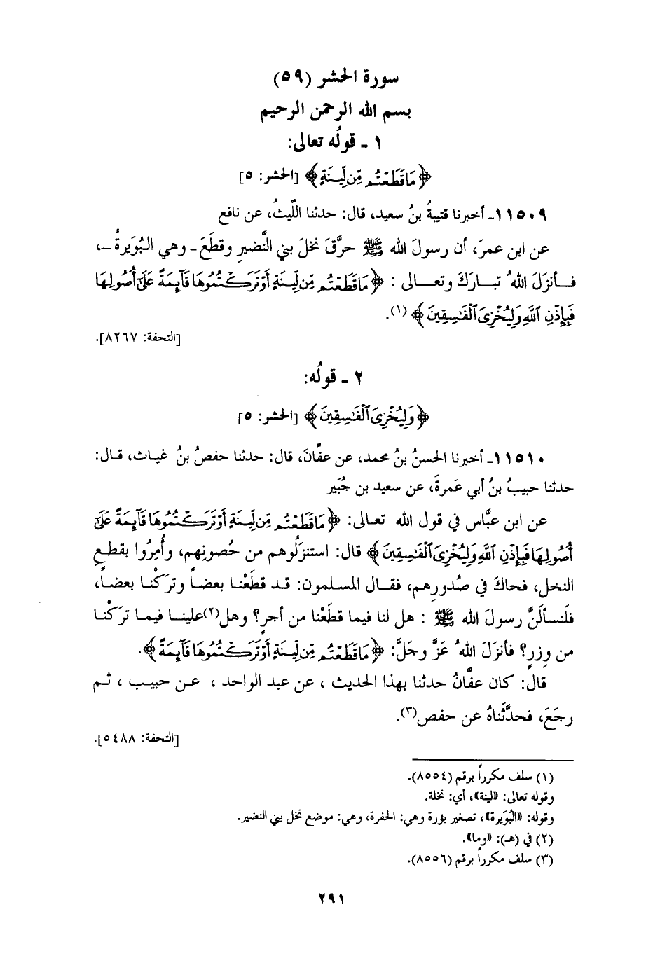 11509 - أَخْبَرَنَا قُتَيْبَةُ بْنُ سَعِيدٍ، قَالَ: حَدَّثَنَا اللَّيْثُ، عَنْ نَافِعٍ، عَنِ ابْنِ عُمَرَ، أَنَّ رَسُولَ اللهِ صَلَّى اللهُ عَلَيْهِ وَسَلَّمَ §حَرَّقَ نَخْلَ بَنِي النَّضِيرِ وَقَطَعَ، وَهِيَ الْبُوَيْرَةُ، فَأَنْزَلَ اللهُ تَبَارَكَ وَتَعَالَى {مَا قَطَعْتُمْ مِنْ لِينَةٍ أَوْ تَرَكْتُمُوهَا قَائِمَةً عَلَى أُصُولِهَا فَبِإِذْنِ اللهِ وَلِيُخْزِيَ الْفَاسِقِينَ} [الحشر: 5]