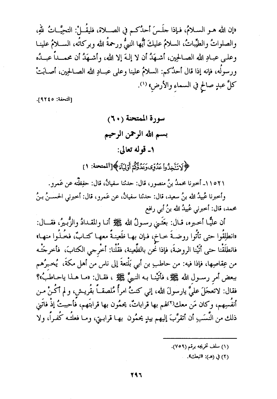 11521 - أَخْبَرَنَا مُحَمَّدُ بْنُ مَنْصُورٍ، قَالَ: حَدَّثَنَا سُفْيَانُ، قَالَ: حَفِظْتُهُ عَنْ عَمْرٍو، وَأَخْبَرَنَا عُبَيْدُ اللهِ بْنُ سَعِيدٍ، قَالَ: حَدَّثَنَا سُفْيَانُ، عَنْ عَمْرٍو، قَالَ: أَخْبَرَنِي الْحَسَنُ بْنُ مُحَمَّدٍ، قَالَ: أَخْبَرَنِي عُبَيْدُ اللهِ بْنُ أَبِي رَافِعٍ أَنَّ عَلِيًّا أَخْبَرَهُ , قَالَ: بَعَثَنِي رَسُولُ اللهِ صَلَّى اللهُ عَلَيْهِ وَسَلَّمَ، أَنَا وَالْمِقْدَادُ وَالزُّبَيْرُ , فَقَالَ: «انْطَلِقُوا حَتَّى تَأْتُوا رَوْضَةَ خَاخٍ، فَإِنَّ بِهَا ظَعِينَةً مَعَهَا كِتَابٌ، فَخُذُوا مِنْهَا» , فَانْطَلَقْنَا حَتَّى أَتَيْنَا الرَّوْضَةَ، فَإِذَا نَحْنُ بِالظَّعِينَةِ، فَقُلْنَا: أَخْرِجِي الْكِتَابَ، فَأَخْرَجَتْهُ مِنْ عِقَاصِهَا، فَإِذَا فِيهِ: مِنْ حَاطِبِ بْنِ أَبِي بَلْتَعَةَ إِلَى نَاسٍ مِنْ أَهْلِ مَكَّةَ , يُخْبِرُهُمْ بِبَعْضِ أَمْرِ رَسُولِ اللهِ صَلَّى اللهُ عَلَيْهِ وَسَلَّمَ، فَأَتَيْنَا بِهِ النَّبِيَّ صَلَّى اللهُ عَلَيْهِ وَسَلَّمَ , فَقَالَ: «مَا هَذَا يَا حَاطِبُ؟» , فَقَالَ: لَا تَعْجَلْ عَلَيَّ يَا رَسُولَ اللهِ، إِنِّي كُنْتُ امْرَأً مُلْصَقًا بِقُرَيْشٍ، وَلَمْ أَكُنْ مِنْ أَنْفُسِهِمْ، وَكَانَ مَنْ مَعَكَ لَهُمْ بِهَا قَرَابَاتٌ يَحْمُونَ بِهَا قَرَابَتَهُمْ، فَأَحْبَبْتُ إِذْ فَاتَنِي ذَلِكَ مِنَ النَّسَبِ أَنْ أَتَقَرَّبَ إِلَيْهِمْ بِيَدٍ يَحْمُونَ بِهَا قَرَابَتِي، وَمَا فَعَلْتُهُ كُفْرًا وَلَا ارْتِدَادًا عَنْ دِينِي، وَلَا رِضًى بِالْكُفْرِ بَعْدَ الْإِسْلَامِ، فَقَالَ النَّبِيُّ صَلَّى اللهُ عَلَيْهِ وَسَلَّمَ: «قَدْ صَدَقَكُمْ» , فَقَالَ عُمَرُ: يَا رَسُولَ اللهِ، دَعْنِي أَضْرِبْ عُنُقَ يَعْنِي هَذَا، فَقَالَ: " يَا عُمَرُ، مَا يُدْرِيكَ، §لَعَلَّ اللهَ اطَّلَعَ عَلَى أَهْلِ بَدْرٍ فَقَالَ: اعْمَلُوا مَا شِئْتُمْ، فَقَدْ غَفَرْتُ لَكُمْ " وَاللَّفْظُ لِعُبَيْدِ اللهِ، وَزَادَ مُحَمَّدٌ فِي حَدِيثِهِ: فَأَنْزَلَ اللهُ عَزَّ وَجَلَّ {لَا تَتَّخِذُوا عَدُوِّي وَعَدُوَّكُمْ أَوْلِيَاءَ} [الممتحنة: 1] السُّورَةَ كُلَّهَا