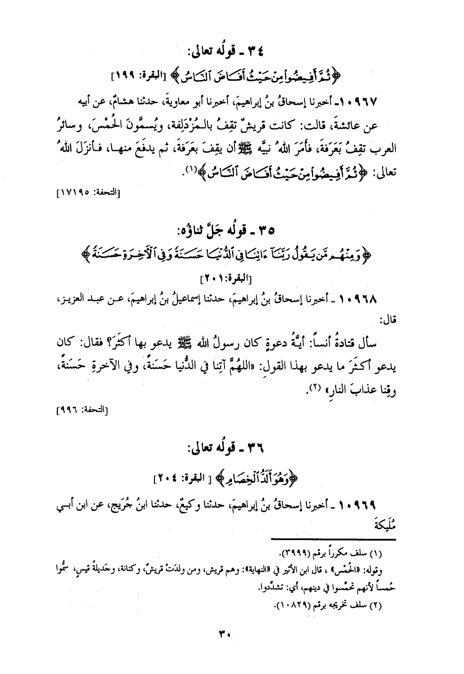 10967 - أَخْبَرَنَا إِسْحَاقُ بْنُ إِبْرَاهِيمَ، أَخْبَرَنَا أَبُو مُعَاوِيَةَ، حَدَّثَنَا هِشَامٌ، عَنْ أَبِيهِ، عَنْ عَائِشَةَ، قَالَتْ: " كَانَتْ §قُرَيْشٌ تَقِفُ بِالْمُزْدَلِفَةِ وَيُسَمَّوْنَ الْحُمْسَ، وَسَائِرُ الْعَرَبِ تَقِفُ بِعَرَفَةَ، فَأَمَرَ اللهُ نَبِيَّهُ صَلَّى اللهُ عَلَيْهِ وَسَلَّمَ أَنْ يَقِفَ بِعَرَفَةَ، ثُمَّ يَدْفَعُ مِنْهَا، فَأَنْزَلَ اللهُ تَعَالَى {ثُمَّ أَفِيضُوا مِنْ حَيْثُ أَفَاضَ النَّاسُ} [البقرة: 199]