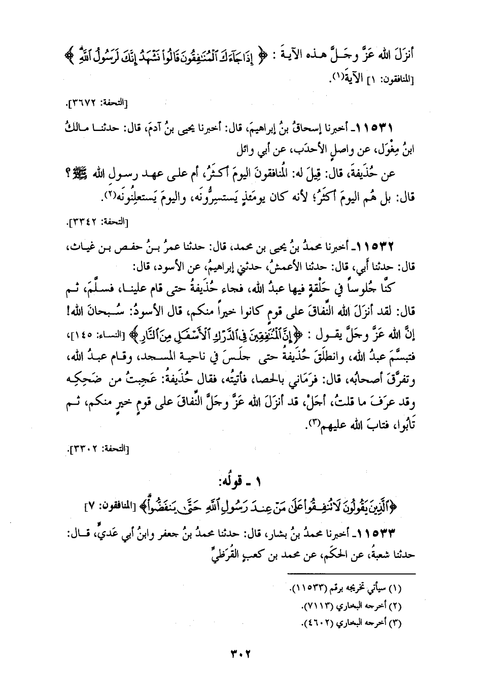 11531 - أَخْبَرَنَا إِسْحَاقُ بْنُ إِبْرَاهِيمَ، قَالَ: أَخْبَرَنَا يَحْيَى بْنُ آدَمَ، قَالَ: حَدَّثَنَا مَالِكُ بْنُ مِغْوَلٍ، عَنْ وَاصِلٍ الْأَحْدَبِ، عَنْ أَبِي وَائِلٍ، عَنْ حُذَيْفَةَ، قَالَ: قِيلَ لَهُ: §الْمُنَافِقُونَ الْيَوْمَ أَكْثَرُ أَمْ عَلَى عَهْدِ رَسُولِ اللهِ صَلَّى اللهُ عَلَيْهِ وَسَلَّمَ؟ , قَالَ: «بَلْ هُمُ الْيَوْمَ أَكْثَرُ؛ لِأَنَّهُ كَانَ يَوْمَئِذٍ يَسْتَسِرُّونَهُ وَالْيَوْمَ يَسْتَعْلِنُونَهُ»