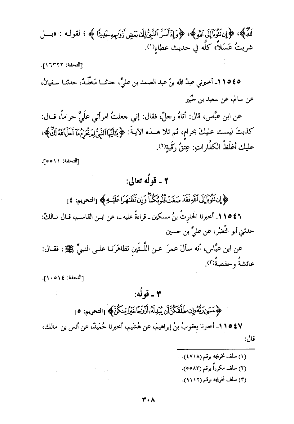 11545 - أَخْبَرَنِي عَبْدُ اللهِ بْنُ عَبْدِ الصَّمَدِ بْنِ عَلِيٍّ، حَدَّثَنَا مَخْلَدٌ، حَدَّثَنَا سُفْيَانُ، عَنْ سَالِمٍ، عَنْ سَعِيدِ بْنِ جُبَيْرٍ، عَنِ ابْنِ عَبَّاسٍ، قَالَ: " أَتَاهُ رَجُلٌ , فَقَالَ: إِنِّي جَعَلْتُ امْرَأَتِي عَلَيَّ حَرَامًا؟ , قَالَ: كَذَبْتَ، لَيْسَتْ عَلَيْكَ بِحَرَامٍ، ثُمَّ تَلَا هَذِهِ الْآيَةَ {§يَا أَيُّهَا النَّبِيُّ لِمَ تُحَرِّمُ مَا أَحَلَّ اللهُ لَكَ} [التحريم: 1] , عَلَيْكَ أَغْلَظُ الْكَفَّارَاتِ: عِتْقُ رَقَبَةٍ "