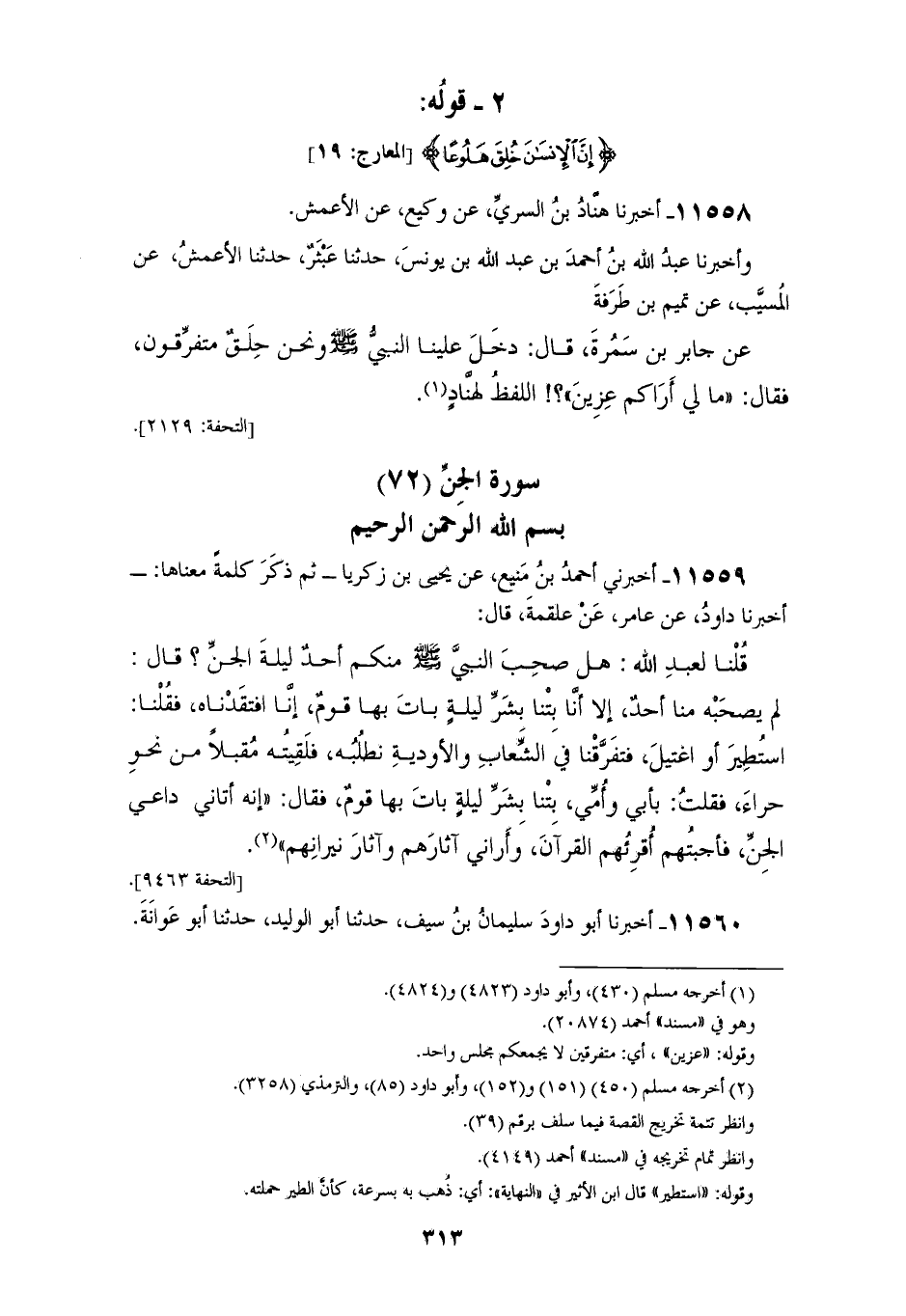 11559 - أَخْبَرَنِي أَحْمَدُ بْنُ مَنِيعٍ، عَنْ يَحْيَى بْنِ زَكَرِيَّا، ثُمَّ ذَكَرَ كَلِمَةً مَعْنَاهَا: أَخْبَرَنَا دَاوُدُ، عَنْ عَامِرٍ، عَنْ عَلْقَمَةَ، قَالَ: قُلْنَا لِعَبْدِ اللهِ: هَلْ صَحِبَ النَّبِيَّ صَلَّى اللهُ عَلَيْهِ وَسَلَّمَ مِنْكُمْ أَحَدٌ لَيْلَةَ الْجِنِّ؟ , قَالَ: لَمْ يَصْحَبْهُ مِنَّا أَحَدٌ إِلَّا أَنَا، بِتْنَا بِشَرِّ لَيْلَةٍ بَاتَ بِهَا قَوْمٌ، إِنَّا افْتَقَدْنَاهُ , فَقُلْنَا: اسْتُطِيرَ أَوِ اغْتِيلَ، فَتَفَرَّقْنَا فِي الشِّعَابِ وَالْأَوْدِيَةِ نَطْلُبُهُ، فَلَقِيتُهُ مُقْبِلًا مِنْ نَحْوِ حِرَاءَ، فَقُلْتُ: بِأَبِي وَأُمِّي، بِتْنَا بِشَرِّ لَيْلَةٍ بَاتَ بِهَا قَوْمٌ، فَقَالَ: «إِنَّهُ §أَتَانِي دَاعِي الْجِنِّ فَأَجَبْتُهُمْ أُقْرِئُهُمُ الْقُرْآنَ» , وَأَرَانِي آثَارَهَمْ وَآثَارَ نِيرَانِهِمْ