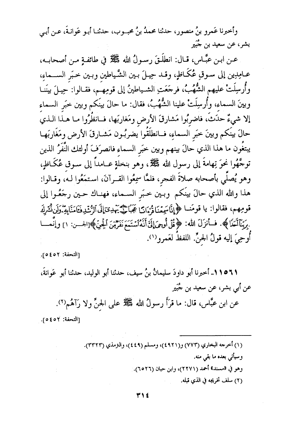 11560 - أَخْبَرَنَا أَبُو دَاوُدَ سُلَيْمَانُ بْنُ سَيْفٍ، حَدَّثَنَا أَبُو الْوَلِيدِ، حَدَّثَنَا أَبُو عَوَانَةَ، وَأَخْبَرَنَا عَمْرُو بْنُ مَنْصُورٍ، حَدَّثَنَا مُحَمَّدُ بْنُ مَحْبُوبٍ، حَدَّثَنَا أَبُو عَوَانَةَ، عَنْ أَبِي بِشْرٍ، عَنْ سَعِيدِ بْنِ جُبَيْرٍ، عَنِ ابْنِ عَبَّاسٍ، قَالَ: " انْطَلَقَ رَسُولُ اللهِ صَلَّى اللهُ عَلَيْهِ وَسَلَّمَ فِي طَائِفَةٍ مِنْ أَصْحَابِهِ عَامِدِينَ إِلَى سُوقِ عُكَاظٍ، وَقَدْ حِيلَ بَيْنَ الشَّيَاطِينِ وَبَيْنَ خَبَرِ السَّمَاءِ، وَأُرْسِلَتْ عَلَيْهِمُ الشُّهُبُ، فَرَجَعَتِ الشَّيَاطِينُ إِلَى قَوْمِهِمْ فَقَالُوا: حِيلَ بَيْنَنَا وَبَيْنَ السَّمَاءِ، وَأُرْسِلَتْ عَلَيْنَا الشُّهُبُ، فَقَالَ: مَا حَالَ بَيْنَكُمْ وَبَيْنَ خَبَرِ السَّمَاءِ إِلَّا شَيْءٌ حَدَثَ، فَاضْرِبُوا مَشَارِقَ الْأَرْضِ وَمَغَارِبَهَا، فَانْظُرُوا مَا هَذَا الَّذِي حَالَ بَيْنَكُمْ وَبَيْنَ خَبَرِ السَّمَاءِ؟، فَانْطَلَقُوا يَضْرِبُونَ مَشَارِقَ الْأَرْضِ وَمَغَارِبَهَا، يَبْتَغُونَ مَا هَذَا الَّذِي حَالَ بَيْنَهُمْ وَبَيْنَ خَبَرِ السَّمَاءِ، فَانْصَرَفَ أُولَئِكَ النَّفَرِ الَّذِينَ تَوَجَّهُوا نَحْوَ تِهَامَةَ إِلَى رَسُولِ اللهِ صَلَّى اللهُ عَلَيْهِ وَسَلَّمَ وَهُو بِنَخْلَةَ عَامِدًا إِلَى سُوقِ عُكَاظٍ، وَهُو يُصَلِّي بِأَصْحَابِهِ صَلَاةَ الْفَجْرِ، فَلَمَّا سَمِعُوا الْقُرْآنَ اسْتَمَعُوا لَهُ، وَقَالُوا: هَذَا وَاللهِ الَّذِي حَالَ بَيْنَكُمْ وَبَيْنَ خَبَرِ السَّمَاءِ، فَهُنَاكَ حِينَ رَجَعُوا إِلَى قَوْمِهِمْ، فَقَالُوا: يَا قَوْمَنَا: {إِنَّا سَمِعْنَا قُرْآنًا عَجَبًا يَهْدِي إِلَى الرُّشْدِ فَآمَنَّا بِهِ وَلَنْ نُشْرِكَ بِرَبِّنَا أَحَدًا} [الجن: 2]، فَأَنْزَلَ اللهُ {§قُلْ أُوحِيَ إِلَيَّ أَنَّهُ اسْتَمَعَ نَفَرٌ مِنَ الْجِنِّ} [الجن: 1] وَإِنَّمَا أُوحِيَ إِلَيْهِ قَوْلُ الْجِنِّ، اللَّفْظُ لِعَمْرٍو