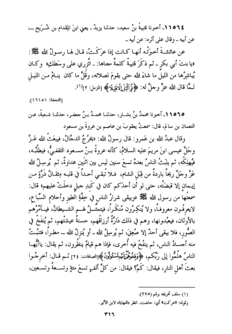 11565 - أَخْبَرَنَا مُحَمَّدُ بْنُ بَشَّارٍ، حَدَّثَنَا مُحَمَّدُ بْنُ جَعْفَرٍ، حَدَّثَنَا شُعْبَةُ، عَنِ النُّعْمَانِ بْنِ سَالِمٍ، قَالَ: سَمِعْتُ يَعْقُوبَ بْنَ عَاصِمِ بْنِ عُرْوَةَ بْنِ مَسْعُودٍ، وَقَالَ عَبْدُ اللهِ بْنُ عَمْرٍو: قَالَ رَسُولُ اللهِ: «§يَخْرُجُ الدَّجَّالُ، فَيَبْعَثُ اللهُ عَزَّ وَجَلَّ عِيسَى ابْنَ مَرْيَمَ عَلَيْهِ السَّلَامُ كَأَنَّهُ عُرْوَةُ بْنُ مَسْعُودٍ الثَّقَفِيُّ، فَيَطْلُبُهُ فَيُهْلِكُهُ، ثُمَّ يَلْبَثُ النَّاسُ بَعْدَهُ تِسْعَ سِنِينَ لَيْسَ بَيْنَ اثْنَيْنِ عَدَاوَةٌ، ثُمَّ يُرْسِلُ اللهُ عَزَّ وَجَلَّ رِيحًا بَارِدَةً مِنْ قِبَلِ الشَّامِ، فَلَا تُبْقِي أَحَدًا فِي قَلْبِهِ مِثْقَالُ ذَرَّةٍ مِنْ إِيمَانٍ إِلَّا قَبْضَتْهُ، حَتَّى لَوْ أَنَّ أَحَدَكُمْ كَانَ فِي كَبِدِ جَبَلٍ دَخَلَتْ عَلَيْهِمْ»، قَالَ: سَمِعْتُهَا مِنْ رَسُولِ اللهِ صَلَّى اللهُ عَلَيْهِ وَسَلَّمَ: " وَيَبْقَى شِرَارُ النَّاسِ فِي خِفَّةِ الطَّيْرِ، وَأَحْلَامِ السِّبَاعِ، لَا يَعْرِفُونَ مَعْرُوفًا، وَلَا يُنْكِرُونَ مُنْكَرًا، فَيَتَمَثَّلُ لَهُمُ الشَّيْطَانُ فَيَأْمُرُهُمْ بِالْأَوْثَانِ فَيَعْبُدُونَهَا، وَهُمْ فِي ذَلِكَ دَارَّةٌ أَرْزَاقُهُمْ، حَسَنَةٌ عِيْشَتُهُمْ، ثُمَّ يُنْفُخُ فِي الصُّورِ فَلَا يَبْقَى أَحَدٌ إِلَّا صُعِقَ، ثُمَّ يُرْسِلُ اللهُ - أَوْ يُنْزِلُ اللهُ - مَطَرًا، فَتُنْبُتُ مِنْهُ أَجْسَادُ النَّاسِ، ثُمَّ يُنْفَخُ فِيهِ أُخْرَى فَإِذَا هُمْ قِيَامٌ يَنْظُرُونَ، ثُمَّ يُقَالُ: يَا أَيُّهَا النَّاسُ، هَلُمُّوا إِلَى رَبِّكَمْ {وَقِفُوهُمْ إِنَّهُمْ مَسْئُولُونَ} [الصافات: 24]، ثُمَّ قَالَ: أَخْرِجُوا بَعْثَ أَهْلِ النَّارِ، فَيُقَالُ: كَمْ؟، فَيُقَالُ: مِنْ كُلِّ أَلْفٍ تِسْعُمِائَةٍ وَتِسْعَةٌ وَتِسْعُونَ، فَيَوْمَئِذٍ يُبْعَثُ {الْوِلْدَانُ شِيبًا} [المزمل: 17] وَيَوْمَئِذٍ {يُكْشَفُ عَنْ سَاقٍ} [القلم: 42] قَالَ مُحَمَّدُ بْنُ جَعْفَرٍ: حَدَّثَنِي شُعْبَةُ بِهَذَا الْحَدِيثِ، عَنِ النُّعْمَانِ بْنِ سَالِمٍ وَعَرَضْتُهُ عَلَيْهِ