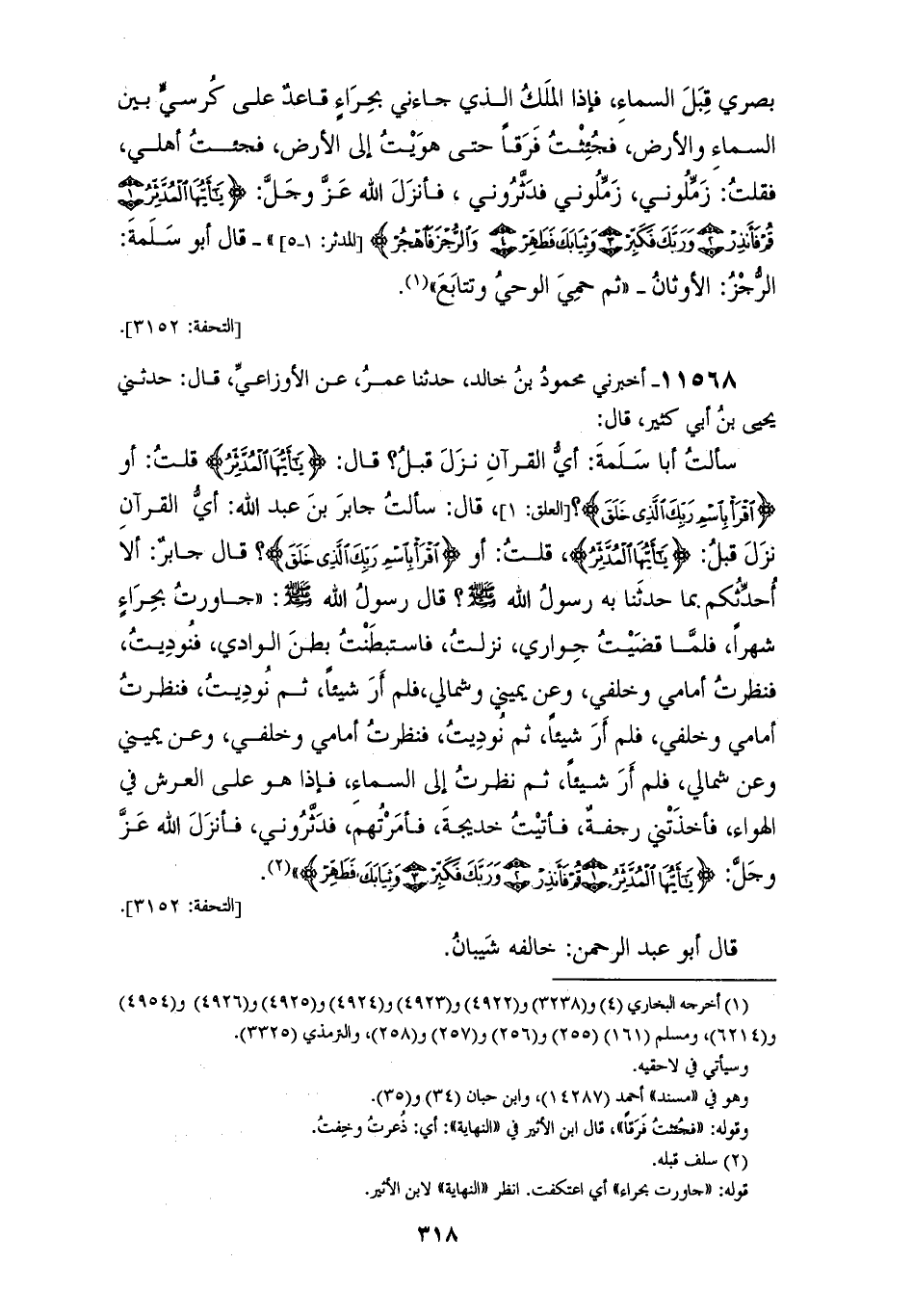 11568 - أَخْبَرَنِي مَحْمُودُ بْنُ خَالِدٍ، حَدَّثَنَا عُمَرُ، عَنِ الْأَوْزَاعِيِّ، قَالَ: حَدَّثَنِي يَحْيَى بْنُ أَبِي كَثِيرٍ، قَالَ: سَأَلْتُ أَبَا سَلَمَةَ: أَيُّ الْقُرْآنِ نَزَلَ قَبْلُ؟، قَالَ: {يَا أَيُّهَا الْمُدَّثِّرُ} [المدثر: 1] قُلْتُ: أَوِ {اقْرَأْ بِاسْمِ رَبِّكَ الَّذِي خَلَقَ} [العلق: 1]؟، قَالَ: سَأَلْتُ جَابِرَ بْنَ عَبْدِ اللهِ: أَيُّ الْقُرْآنِ نَزَلَ قَبْلُ؟ {يَا أَيُّهَا الْمُدَّثِّرُ} [المدثر: 1]، قُلْتُ: أَوِ {اقْرَأْ بِاسْمِ رَبِّكَ الَّذِي خَلَقَ} [العلق: 1]؟، قَالَ جَابِرٌ: أَلَا أُحَدِّثُكُمْ بِمَا حَدَّثَنَا بِهِ رَسُولُ اللهِ صَلَّى اللهُ عَلَيْهِ وَسَلَّمَ؟، قَالَ رَسُولُ اللهِ صَلَّى اللهُ عَلَيْهِ وَسَلَّمَ: " جَاوَرْتُ بِحِرَاءٍ شَهْرًا، فَلَمَّا قَضَيْتُ جِوَارِي نَزَلْتُ فَاسْتَبْطَنْتُ بَطْنَ الْوَادِي، فَنُودِيتُ فَنَظَرْتُ أَمَامِي وَخَلْفِي، وَعَنْ يَمِينِي وَشِمَالِي، فَلَمْ أَرَ شَيْئًا، ثُمَّ نُودِيتُ فَنَظَرْتُ أَمَامِي وَخَلْفِي، فَلَمْ أَرَ شَيْئًا، ثُمَّ نُودِيتُ فَنَظَرْتُ أَمَامِي وَخَلْفِي، وَعَنْ يَمِينِي وَعَنْ شِمَالِي، فَلَمْ أَرَ شَيْئًا، ثُمَّ نَظَرْتُ إِلَى السَّمَاءِ فَإِذَا هُوَ عَلَى الْعَرْشِ فِي الْهَوَاءِ، فَأَخَذَتْنِي رَجْفَةٌ فَأَتَيْتَ خَدِيجَةَ فَأَمَرْتُهُمْ فَدَثَّرُونِي، فَأَنْزَلَ اللهُ عَزَّ وَجَلَّ {§يَا أَيُّهَا الْمُدَّثِّرُ قُمْ فَأَنْذِرْ وَرَبَّكَ فَكَبِّرْ وَثِيَابَكَ فَطَهِّرْ} [المدثر: 2]، قَالَ أَبُو عَبْدِ الرَّحْمَنِ: خَالَفَهُ شَيْبَانُ