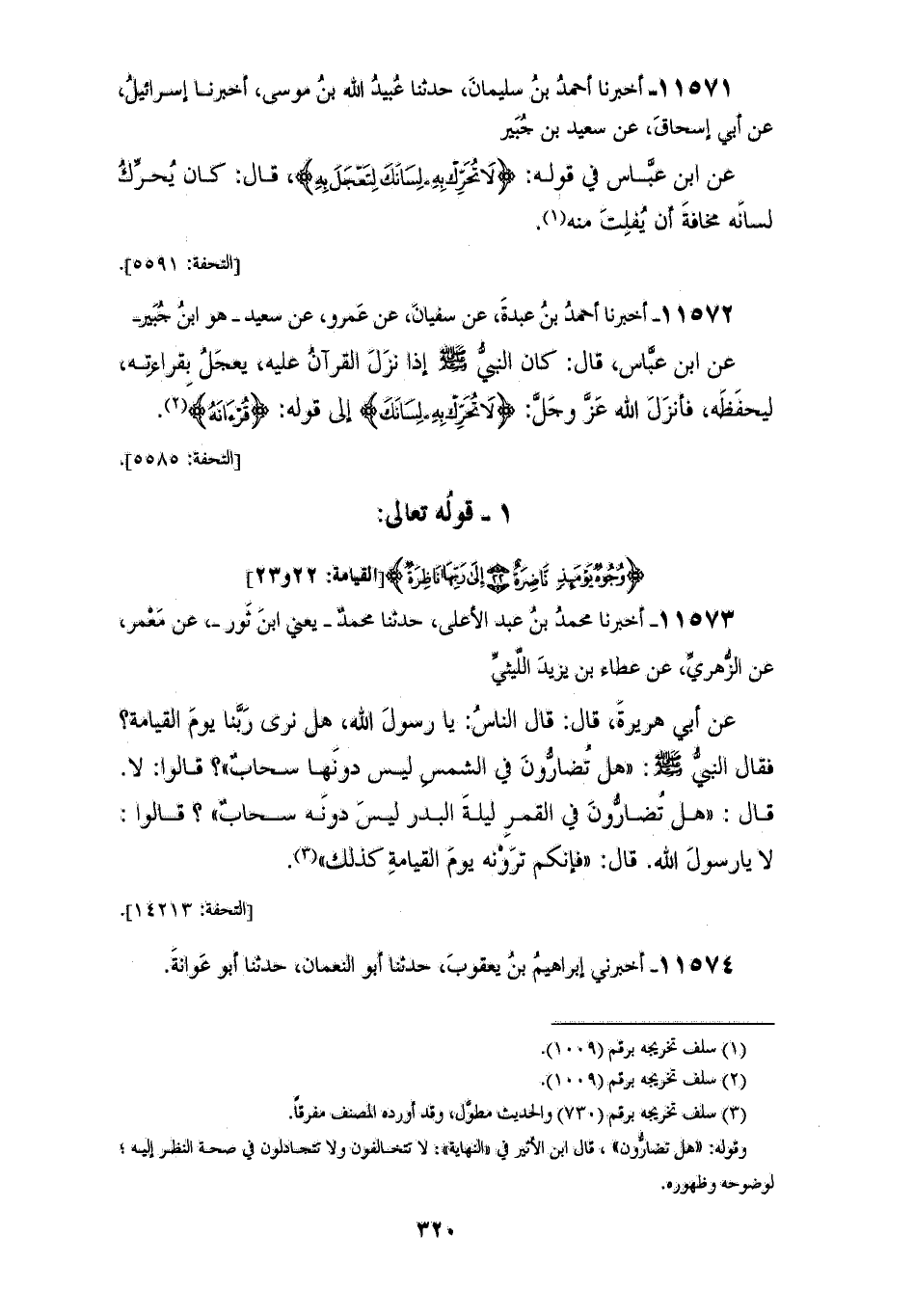 11571 - أَخْبَرَنَا أَحْمَدُ بْنُ سُلَيْمَانَ، حَدَّثَنَا عُبَيْدُ اللهِ بْنُ مُوسَى، أَخْبَرَنَا إِسْرَائِيلُ، عَنْ أَبِي إِسْحَاقَ، عَنْ سَعِيدِ بْنِ جُبَيْرٍ، عَنِ ابْنِ عَبَّاسٍ، فِي قَوْلِهِ: {§لَا تُحَرِّكْ بِهِ لِسَانَكَ لِتَعْجَلَ بِهِ} [القيامة: 16] قَالَ: «كَانَ يُحَرِّكُ لِسَانَهُ مَخَافَةَ أَنْ يَفْلِتَ مِنْهُ»