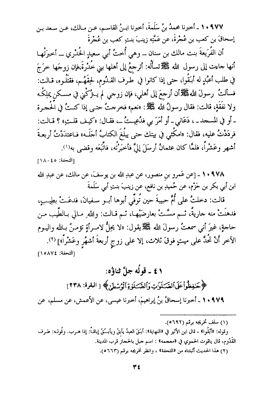 10977 - أَخْبَرَنَا مُحَمَّدُ بْنُ سَلَمَةَ، أَخْبَرَنَا ابْنُ الْقَاسِمِ، عَنْ مَالِكٍ، عَنْ سَعْدِ بْنِ إِسْحَاقَ بْنِ كَعْبِ بْنِ عُجْرَةَ، عَنْ عَمَّتِهِ زَيْنَبَ بِنْتِ كَعْبِ بْنِ عُجْرَةَ، أَنَّ الْفُرَيْعَةَ بِنْتَ مَالِكِ بْنِ سِنَانٍ، وَهِيَ أُخْتُ أَبِي سَعِيدٍ الْخُدْرِيِّ أَخْبَرَتْهَا أَنَّهَا جَاءَتْ إِلَى رَسُولِ اللهِ صَلَّى اللهُ عَلَيْهِ وَسَلَّمَ تَسْأَلُهُ: أَتَرْجِعُ إِلَى أَهْلِهَا بَنِي خُدْرَةَ فَإِنَّ زَوْجَهَا خَرَجَ فِي طَلَبِ أَعْبُدٍ لَهُ أَبَقُوا حَتَّى إِذَا كَانُوا فِي طَرَفِ الْقَدُومِ لَحِقَهُمْ فَقَتَلُوهُ، قَالَتْ: فَسَأَلْتُ رَسُولَ اللهِ صَلَّى اللهُ عَلَيْهِ وَسَلَّمَ أَنْ أَرْجِعَ إِلَى أَهْلِي، فَإِنَّ زَوْجِي لَمْ يَتْرُكْنِي فِي مَسْكَنٍ يَمْلِكُهُ وَلَا نَفَقَةٍ، قَالَتْ: فَقَالَ رَسُولُ اللهِ صَلَّى اللهُ عَلَيْهِ وَسَلَّمَ: «نَعَمْ» فَخَرَجْتُ حَتَّى إِذَا كُنْتُ فِي الْحُجْرَةِ، أَوْ فِي الْمَسْجِدِ، دَعَانِي أَوْ أَمْرَ بِي فَدُعِيتُ فَقَالَ: «كَيْفَ قُلْتِ؟» قَالَتْ: فَرَدَدْتُ عَلَيْهِ، فَقَالَ: «§امْكُثِي فِي بَيْتِكِ حَتَّى يَبْلُغَ الْكِتَابُ أَجَلَهُ» فَاعْتَدَدْتُ أَرْبَعَةَ أَشْهُرٍ وَعَشْرًا، فَلَمَّا كَانَ عُثْمَانُ أَرْسَلَ إِلَيَّ فَأَخْبَرْتُهُ، فَاتَّبَعَهُ وَقَضَى بِهِ