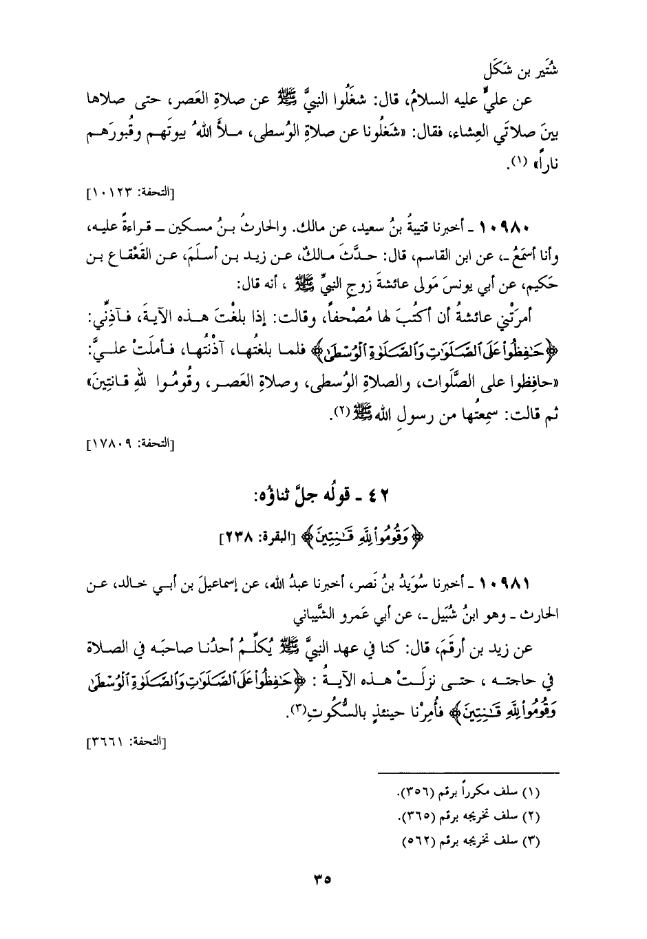 10981 - أَخْبَرَنَا سُوَيْدُ بْنُ نَصْرٍ، أَخْبَرَنَا عَبْدُ اللهِ، عَنْ إِسْمَاعِيلَ بْنِ أَبِي خَالِدٍ، عَنِ الْحَارِثِ وَهُو ابْنُ شُبَيْلٍ، عَنْ أَبِي عَمْرٍو الشَّيْبَانِيِّ، عَنْ زَيْدِ بْنِ أَرْقَمَ، قَالَ: " §كُنَّا فِي عَهْدِ النَّبِيِّ صَلَّى اللهُ عَلَيْهِ وَسَلَّمَ يُكَلِّمُ أَحَدُنَا صَاحِبَهُ فِي الصَّلَاةِ فِي حَاجَتِهِ، حَتَّى نَزَلَتْ هَذِهِ الْآيَةُ {حَافِظُوا عَلَى الصَّلَوَاتِ وَالصَّلَاةِ الْوُسْطَى وَقُومُوا لِلَّهِ قَانِتِينَ} [البقرة: 238] فَأُمِرْنَا حِينَئِذٍ بِالسُّكُوتِ "