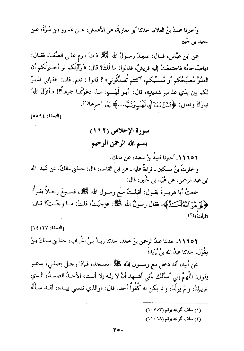 11651 - أَخْبَرَنَا قُتَيْبَةُ بْنُ سَعِيدٍ، عَنْ مَالِكٍ، وَالْحَارِثِ بْنِ مِسْكِينٍ، قِرَاءَةً عَلَيْهِ، عَنِ ابْنِ الْقَاسِمِ، قَالَ: حَدَّثَنِي مَالِكٌ، عَنْ عُبَيْدِ اللهِ بْنِ عَبْدِ الرَّحْمَنِ، عَنْ عُبَيْدِ بْنِ حُنَيْنٍ، قَالَ: سَمِعْتُ أَبَا هُرَيْرَةَ، يَقُولُ: أَقْبَلْتُ مَعَ رَسُولِ اللهِ صَلَّى اللهُ عَلَيْهِ وَسَلَّمَ، §فَسَمِعَ رَجُلًا يَقْرَأُ {قُلْ هُوَ اللهُ أَحَدٌ} [الإخلاص: 1]، فَقَالَ رَسُولُ اللهِ صَلَّى اللهُ عَلَيْهِ وَسَلَّمَ: «وَجَبَتْ»، قُلْتُ: مَا وَجَبَتْ؟، قَالَ: «الْجَنَّةُ»