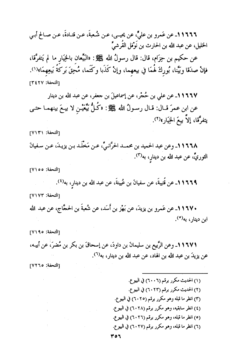 11667 - عَنْ عَلِيِّ بْنِ حُجْرٍ، عَنْ إِسْمَاعِيلَ بْنِ جَعْفَرٍ، عَنْ عَبْدِ اللهِ بْنِ دِينَارٍ، عَنِ ابْنِ عُمَرَ، قَالَ: قَالَ رَسُولُ اللهِ صَلَّى اللهُ عَلَيْهِ وَسَلَّمَ «§كُلُّ بَيِّعَيْنِ لَا بَيْعَ بَيْنَهُمَا حَتَّى يَتَفَرَّقَا، إِلَّا بَيْعَ الْخِيَارِ»