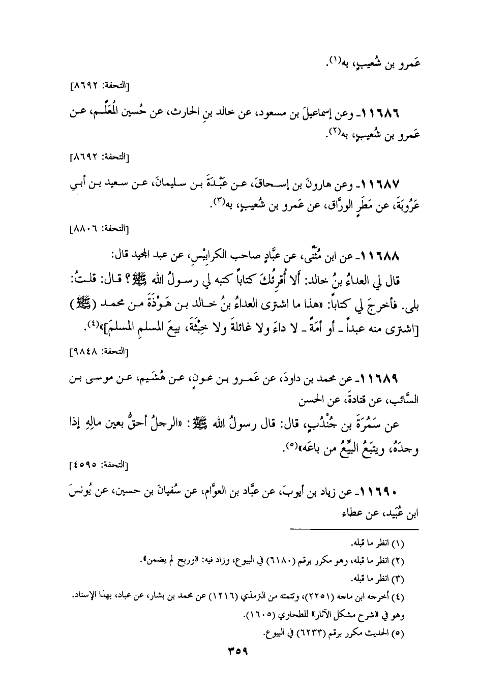 11688 - عَنِ ابْنِ مُثَنَّى، عَنْ عَبَّادٍ، صَاحِبِ الْكَرَابِيسِ، عَنْ عَبْدِ الْمَجِيدِ، قَالَ: قَالَ لِيَ الْعَدَّاءُ بْنُ خَالِدٍ: أَلَا أُقْرِئَكَ كِتَابًا كَتَبَهُ لِي رَسُولُ اللهِ صَلَّى الله عَلَيْه وَسَلَّمَ؟ قَالَ: قُلْتُ: بَلَى. فَأَخْرَجَ لِي كِتَابًا «هَذَا مَا اشْتَرَى الْعَدَّاءُ بْنُ خَالِدِ بْنِ هَوْذَةَ مِنْ مُحَمَّدٍ صَلَّى اللهُ عَلَيْهِ وَسَلَّمَ اشْتَرَى مِنْهُ عَبْدًا - أَوْ أُمَّةً - §لَا دَاءَ وَلَا غَائِلَةَ وَلَا خِبْثَةَ، بَيْعَ الْمُسْلِمِ الْمُسْلِمَ»