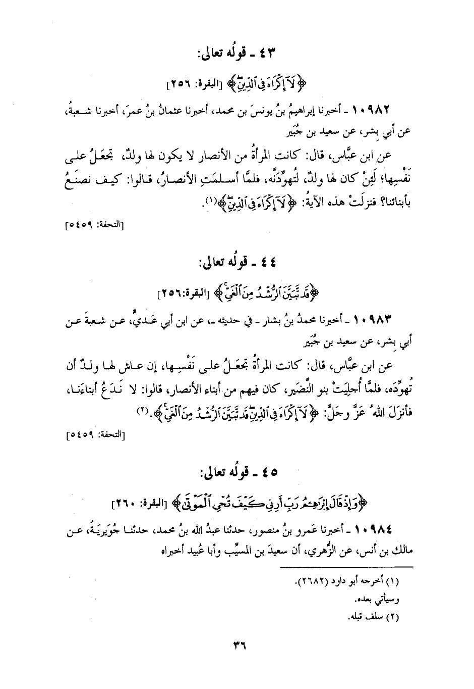 10982 - أَخْبَرَنَا إِبْرَاهِيمُ بْنُ يُونُسَ بْنِ مُحَمَّدٍ، أَخْبَرَنَا عُثْمَانُ بْنُ عُمَرَ، أَخْبَرَنَا شُعْبَةُ، عَنْ أَبِي بِشْرٍ، عَنْ سَعِيدِ بْنِ جُبَيْرٍ، عَنِ ابْنِ عَبَّاسٍ، قَالَ: " كَانَتِ §الْمَرْأَةُ مِنَ الْأَنْصَارِ لَا يَكُونُ لَهَا وَلَدٌ تَجْعَلُ عَلَى نَفْسِهَا لَئِنْ كَانَ لَهَا وَلَدٌ لَتُهَوِّدَنَّهُ، فَلَمَّا أَسْلَمَتِ الْأَنْصَارُ قَالُوا: كَيْفَ نَصْنَعُ بِأَبْنَائِنَا؟ فَنَزَلَتْ هَذِهِ الْآيَةُ {لَا إِكْرَاهَ فِي الدِّينِ} [البقرة: 256]