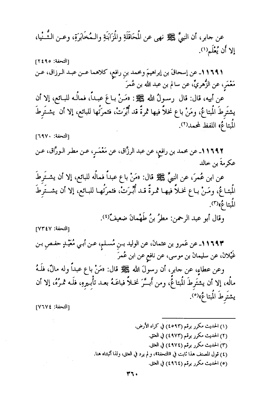 11692 - عَنْ مُحَمَّدِ بْنِ رَافِعٍ، عَنْ عَبْدِ الرَّزَّاقِ، عَنْ مَعْمَرٍ، عَنْ مَطَرٍ الْوَرَّاقِ، عَنْ عِكْرِمَةَ بْنِ خَالِدٍ، عَنِ ابْنِ عُمَرَ، عَنِ النَّبِيِّ صَلَّى اللهُ عَلَيْهِ وَسَلَّمَ قَالَ: «§مَنْ بَاعَ عَبْدًا فَمَالُهُ لِلْبَائِعِ، إِلَّا أَنْ يَشْتَرِطَ الْمُبْتَاعُ، وَمَنْ بَاعَ نَخْلًا فِيهَا ثَمَرَةٌ قَدْ أُبِّرَتْ، فَثَمَرَتُهَا لِلْبَائِعِ، إِلَّا أَنْ يَشْتَرِطَ الْمُبْتَاعُ» وَقَالَ أَبُو عَبْدِ الرَّحْمَنِ: مَطَرُ بْنُ طَهْمَانَ ضَعِيفٌ