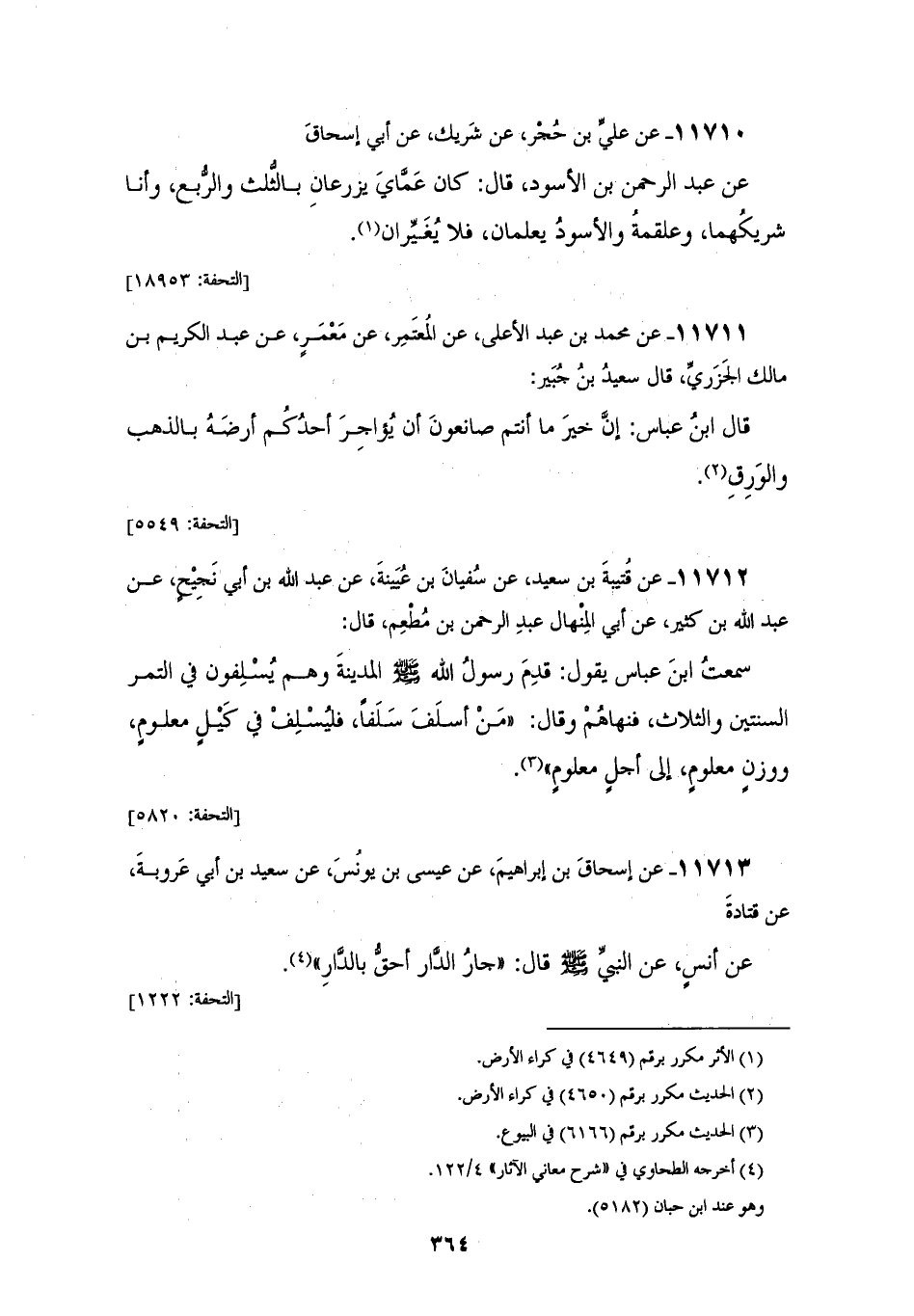 11710 - عَنْ عَلِيِّ بْنِ حُجْرٍ، عَنْ شَرِيكٍ، عَنْ أَبِي إِسْحَاقَ، عَنْ عَبْدِ الرَّحْمَنِ بْنِ الْأَسْوَدِ، قَالَ: «كَانَ عَمَّايَ §يَزْرَعَانِ بِالثُّلُثِ وَالرُّبُعِ، وَأَنَا شَرِيكُهُمَا، وَعَلْقَمَةُ وَالْأَسْوَدُ يَعْلَمَانِ، فَلَا يُغَيِّرَانِ»