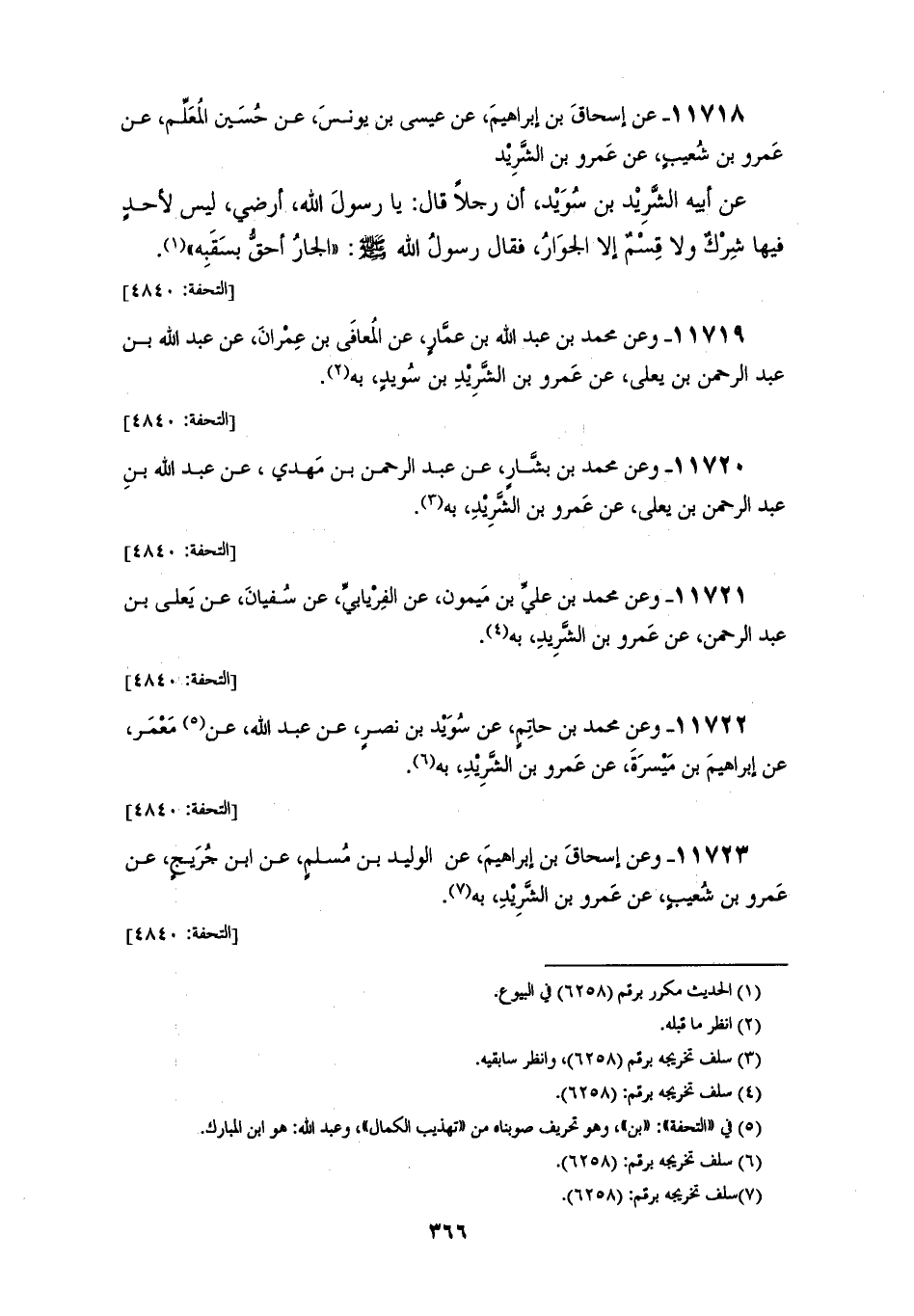 11722 - وَعَنْ مُحَمَّدِ بْنَ حَاتِمٍٍ، عَنْ سُوَيْدِ بْنِ نَصْرٍ، عَنْ عَبْدِ اللهِ، عَنْ مَعْمَرٍ، عَنْ إِبْرَاهِيمَ بْنِ مَيْسَرَةَ، عَنْ عَمْرو بْنِ الشَّرِيدِ، بِهِ