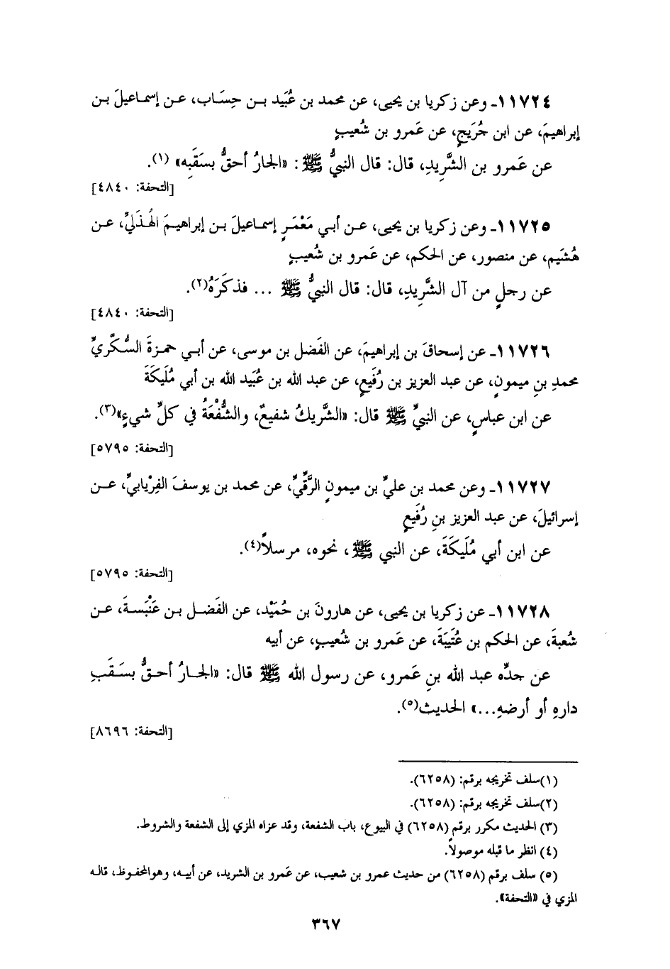 11728 - عَنْ زَكَرِيَّا بْنِ يَحْيَى، عَنْ هَارُونَ بْنِ حُمَيْدٍ، عَنِ الْفَضْلِ بْنِ عَنْبَسَةَ، عَنْ شُعْبَةَ، عَنِ الْحَكَمِ بْنِ عُتَيْبَةَ، عَنْ عَمْرو بْنِ شُعَيْبٍ، عَنْ أَبِيهِ، عَنْ جَدِّهِ عَبْدِ اللهِ بْنِ عَمْرو، عَنْ رَسُولِ اللهِ صَلَّى اللهُ عَلَيْهِ وَسَلَّمَ قَالَ: «§الْجَارُ أَحَقُّ بِسَقَبِ دَارِهِ أَوْ أَرْضِهِ. . .» الْحَدِيثَ