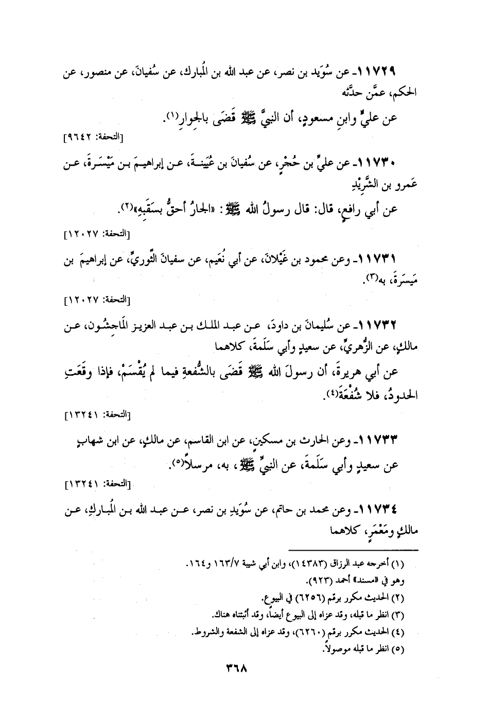 11730 - عَنْ عَلِيِّ بْنِ حُجْرٍ، عَنْ سُفْيَانَ بْنِ عُيَيْنَةَ، عَنْ إِبْرَاهِيمَ بْنِ مَيْسَرَةَ، عَنْ عَمْرو بْنِ الشَّرِيدِ، عَنْ أَبِي رَافِعٍ، قَالَ: قَالَ رَسُولُ اللهِ صَلَّى اللهُ عَلَيْهِ وَسَلَّمَ: «§الْجَارُ أَحَقُّ بِسَقَبِهِ»