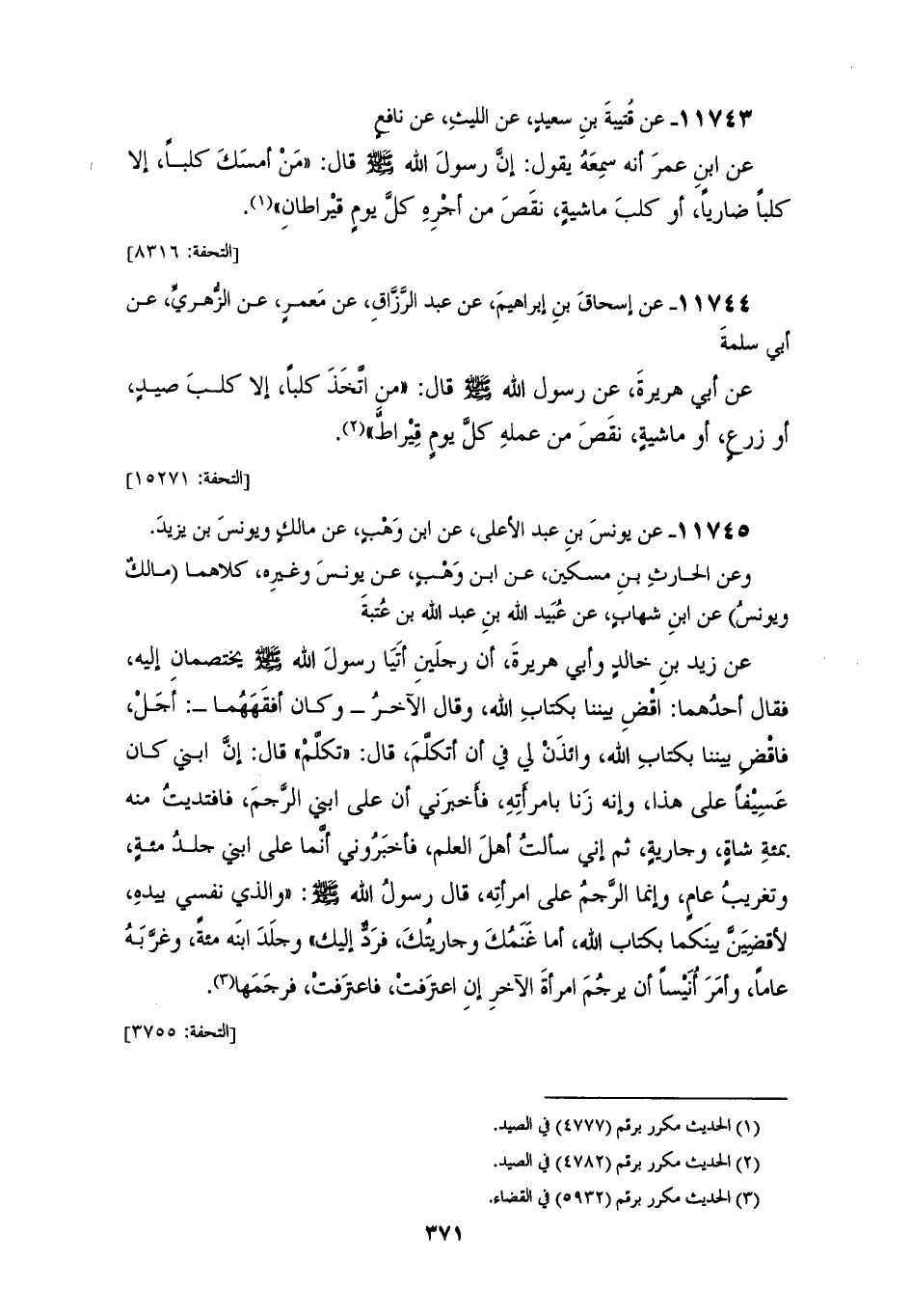 11745 - عَنْ يُونُسَ بْنِ عَبْدِ الْأَعْلَى، عَن ابْنِ وَهْبٍ، عَنْ مَالِكٍ، وَيُونُسَ بْنِ يَزِيدَ، وَعَنِ الْحَارِثِ بْنِ مِسْكِينٍ، عَنِ ابْنِ وَهْبٍ، عَنْ يُونُسَ، وَغَيْرِهِ، كِلَاهُمَا مَالِكٌ وَيُونُسُ عَنِ ابْنِ شِهَابٍ، عَنْ عُبَيْدِ اللهِ بْنِ عَبْدِ اللهِ بْنِ عُتْبَةَ، عَنْ زَيْدِ بْنِ خَالِدٍ، وَأَبِي هُرَيْرَةَ، أَنَّ رَجُلَيْنِ، أَتَيَا رَسُولَ اللهِ صَلَّى اللهُ عَلَيْهِ وَسَلَّمَ يَخْتَصِمَانِ إِلَيْهِ، فَقَالَ أَحَدُهُمَا: اقْضِ بَيْنَنَا بِكِتَابِ اللهِ، وَقَالَ الْآخَرُ - وَكَانَ أَفْقَهَهُمَا -: أَجْلْ، فَاقْضِ بَيْنَنَا بِكِتَابِ اللهِ، وَائْذَنْ لِي فِي أَنْ أَتَكَلَّمَ، قَالَ: «تَكَلَّمْ»، قَالَ: إِنَّ ابْنِي كَانَ عَسِيفًا عَلَى هَذَا، وَإِنَّهُ زَنَى بِامْرَأَتِهِ، فَأَخْبَرَنِي أَنَّ عَلَى ابْنِي الرَّجْمَ، فَافْتَدَيْتُ مِنْهُ بِمَائَةِ شَاةٍ وَجَارِيَةٍ، ثُمَّ إِنِّي سَأَلْتُ أَهْلَ الْعِلْمِ، فَأَخْبَرُونِي أَنَّمَا عَلَى ابْنِي جَلْدُ مَائَةٍ، وَتَغْرِيبُ عَامٍ، وَإِنَّمَا الرَّجْمُ عَلَى امْرَأَتِهِ، قَالَ رَسُولُ اللهِ صَلَّى اللهُ عَلَيْهِ وَسَلَّمَ: «وَالَّذِي نَفْسِي بِيَدِهِ، §لَأَقْضِيَنَّ بَيْنَكُمَا بِكِتَابِ اللهِ، أَمَّا غَنَمُكَ وَجَارِيَتُكَ، فَرَدٌّ إِلَيْكَ» وَجَلَدَ ابْنَهُ مَائَةً، وَغَرَّبَهُ عَامًا، وَأَمَرَ أُنَيْسًا أَنْ يُرْجَمَ امْرَأَةَ الْآخَرِ إِنِ اعْتَرَفَتْ، فَاعْتَرَفَتْ فَرَجَمَهَا