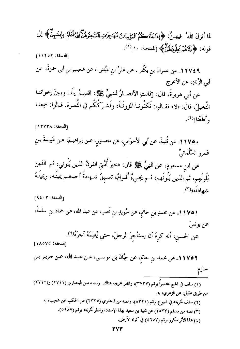 11750 - عَنْ قُتَيْبَةَ، عَنْ أَبِي الْأَحْوَصِ، عَنْ مَنْصُورٍ، عَنْ إِبْرَاهِيمَ، عَنْ عُبَيْدَةَ بْنِ عَمْرٍو السَّلْمَانِيِّ، عَنِ ابْنِ مَسْعُودٍ، عَنِ النَّبِيِّ صَلَّى اللهُ عَلَيْهِ وَسَلَّمَ قَالَ: «§خَيْرُ أُمَّتِي الْقَرْنُ الَّذِينَ يَلُونِي، ثُمَّ الَّذِينَ يَلُونَهُمْ، ثُمَّ الَّذِينَ يَلُونَهُمْ، ثُمَّ يَجِيءُ أَقْوَامٌ تَسْبِقُ شَهَادَةُ أَحَدُهُمْ يَمِينًَهُ، وَيَمِينُهُ شَهَادَتهُ»