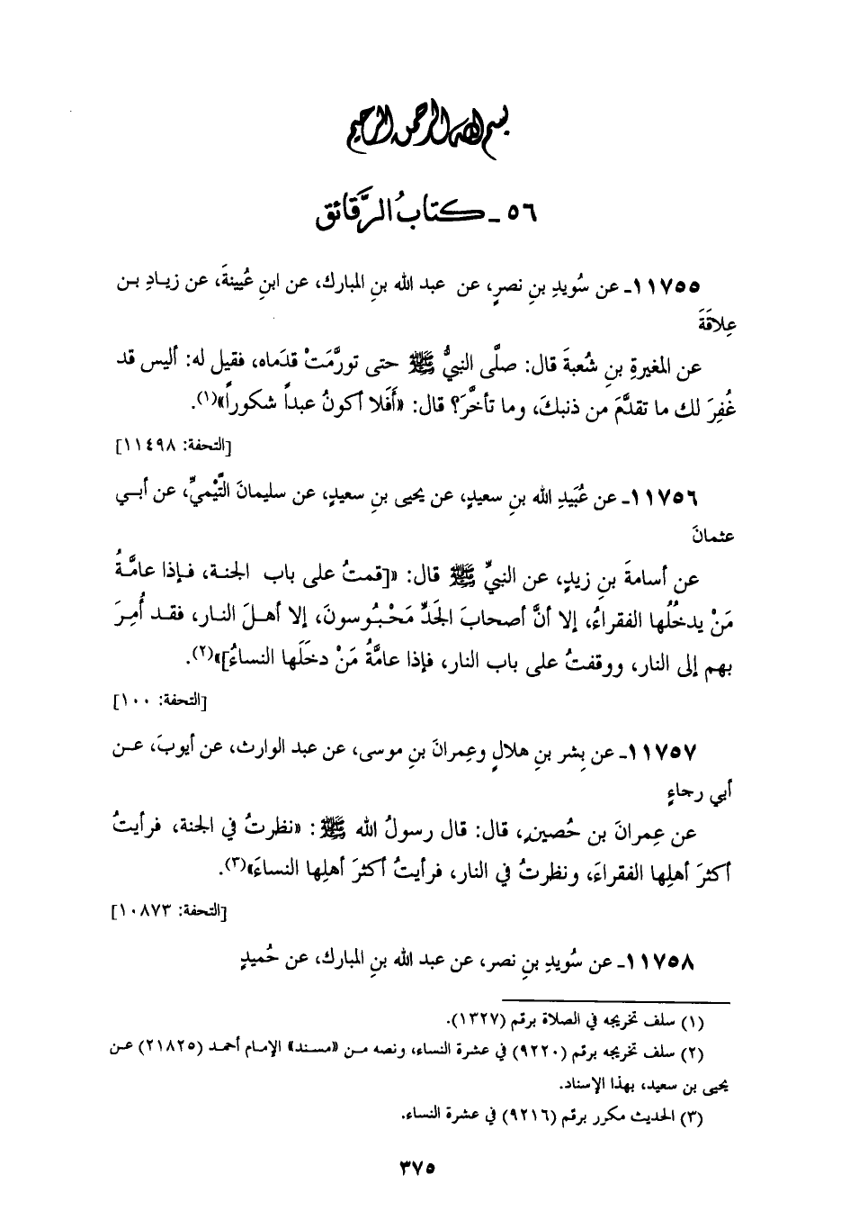 11755 - عَنْ سُوَيْدِ بْنِ نَصْرٍ، عَنْ عَبْدِ اللهِ بْنِ الْمُبَارَكِ، عَنِ ابْنِ عُيَيْنَةَ، عَنْ زِيَادِ بْنِ عِلَاقَةَ، عَنِ الْمُغِيرَةِ بْنِ شُعْبَةَ، قَالَ: صَلَّى النَّبِيُّ صَلَّى اللهُ عَلَيْهِ وَسَلَّمَ حَتَّى تَوَرَّمَتْ قَدَمَاهُ، فَقِيلَ لَهُ: أَلَيْسَ قَدْ غُفِرَ لَكَ مَا تَقَدَّمَ مِنْ ذَنْبِكَ، وَمَا تَأَخَّرَ؟ قَالَ: «§أَفَلَا أَكُونَ عَبْدًا شَكُورًا»
