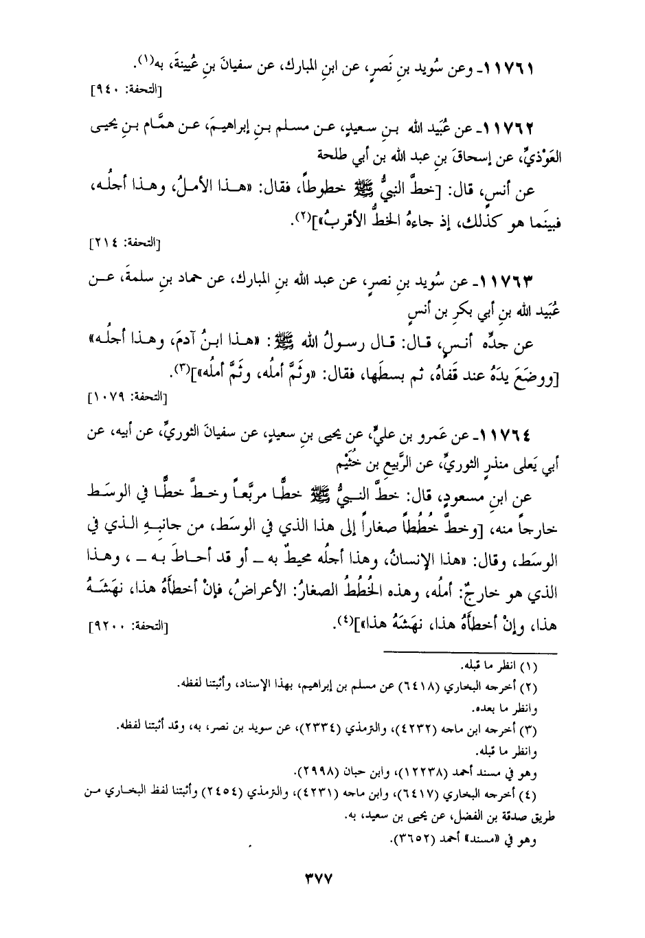 11762 - عَنْ عُبَيْدِ اللهِ بْنِ سَعِيدٍ، عَن مُسْلِمِ بْنِ إِبْرَاهِيمَ، عَنْ هَمَّامِ بْنِ يَحْيَى الْعَوْذِيِّ، عَنْ إِسْحَاقَ بْنِ عَبْدِ اللهِ بْنِ أَبِي طَلْحَةَ، عَنْ أَنَسٍ، قَالَ: خَطَّ النَّبِيُّ صَلَّى اللهُ عَلَيْهِ وَسَلَّمَ خُطُوطًا فَقَالَ: «§هَذَا الْأَمَلُ، وَهَذَا أَجْلُهُ» فَبَيْنَمَا هُوَ كَذَلِكَ، إِذ جَاءَهُ الْخَطُّ الْأَقْرَبُ