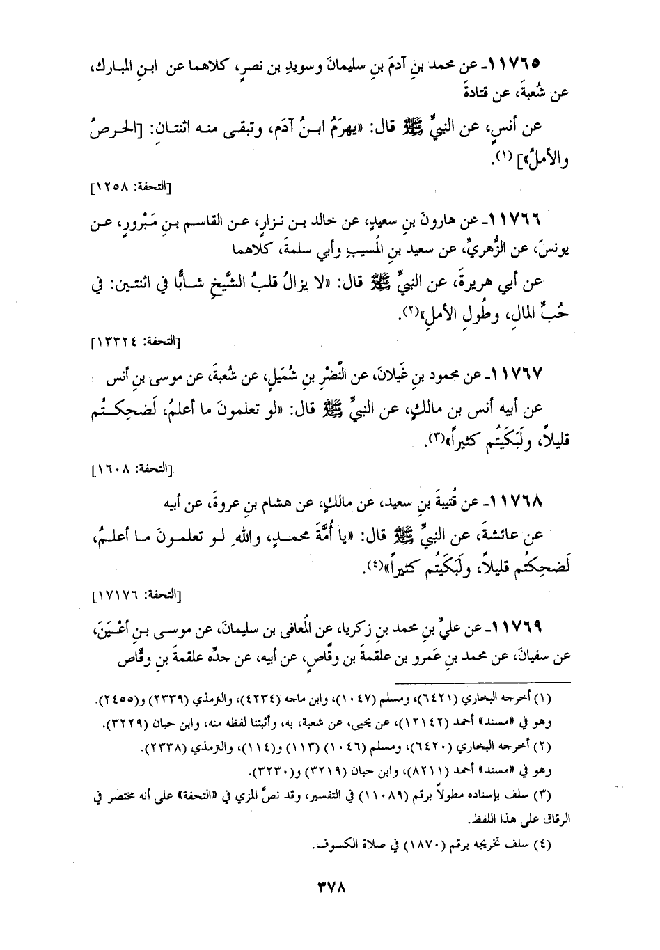 11765 - عَنْ مُحَمَّدِ بْنِ آدَمَ بْنِ سُلَيْمَانَ، وَسُوَيْدِ بْنِ نَصْرٍ، كِلَاهُمَا عَنِ ابْنِ الْمُبَارَكِ، عَنْ شُعْبَةِ، عَنْ قَتَادَةَ، عَنْ أَنَسٍ، عَنِ النَّبِيِّ صَلَّى اللهُ عَلَيْهِ وَسَلَّمَ قَالَ: " §يَهْرَمُ ابْنُ آدَمَ، وَتَبْقَى مِنْهُ اثْنَتَانِ: الْحِرْصُ وَالْأَمَلُ "