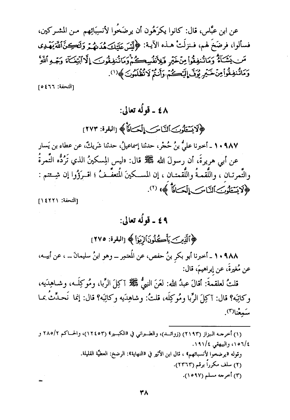 10986 - أَخْبَرَنَا مُحَمَّدُ بْنُ عَبْدِ اللهِ بْنِ عَبْدِ الرَّحِيمِ، حَدَّثَنَا الْفِرْيَابِيُّ، حَدَّثَنَا سُفْيَانُ، عَنِ الْأَعْمَشِ، عَنْ جَعْفَرِ بْنِ إِيَاسٍ، عَنْ سَعِيدِ بْنِ جُبَيْرٍ، عَنِ ابْنِ عَبَّاسٍ، قَالَ: " كَانُوا §يَكْرَهُونَ أَنْ يَرْضَخُوا لِأَنْسِبَائِهِمْ مِنَ الْمُشْرِكِينَ فَسَأَلُوا، فَرَضَخَ لَهُمْ، فَنَزَلَتْ هَذِهِ الْآيَةُ {لَيْسَ عَلَيْكَ هَدَاهُمْ وَلَكِنَّ اللهَ يَهْدِي مَنْ يَشَاءُ وَمَا تُنْفِقُوا مِنْ خَيْرٍ فَلِأَنْفُسِكُمْ وَمَا تُنْفِقُونَ إِلَّا ابْتِغَاءَ وَجْهِ اللهِ وَمَا تُنْفِقُوا مِنْ خَيْرٍ يُوَفَ إِلَيْكُمْ وَأَنْتُمْ لَا تُظْلَمُونَ} [البقرة: 272]