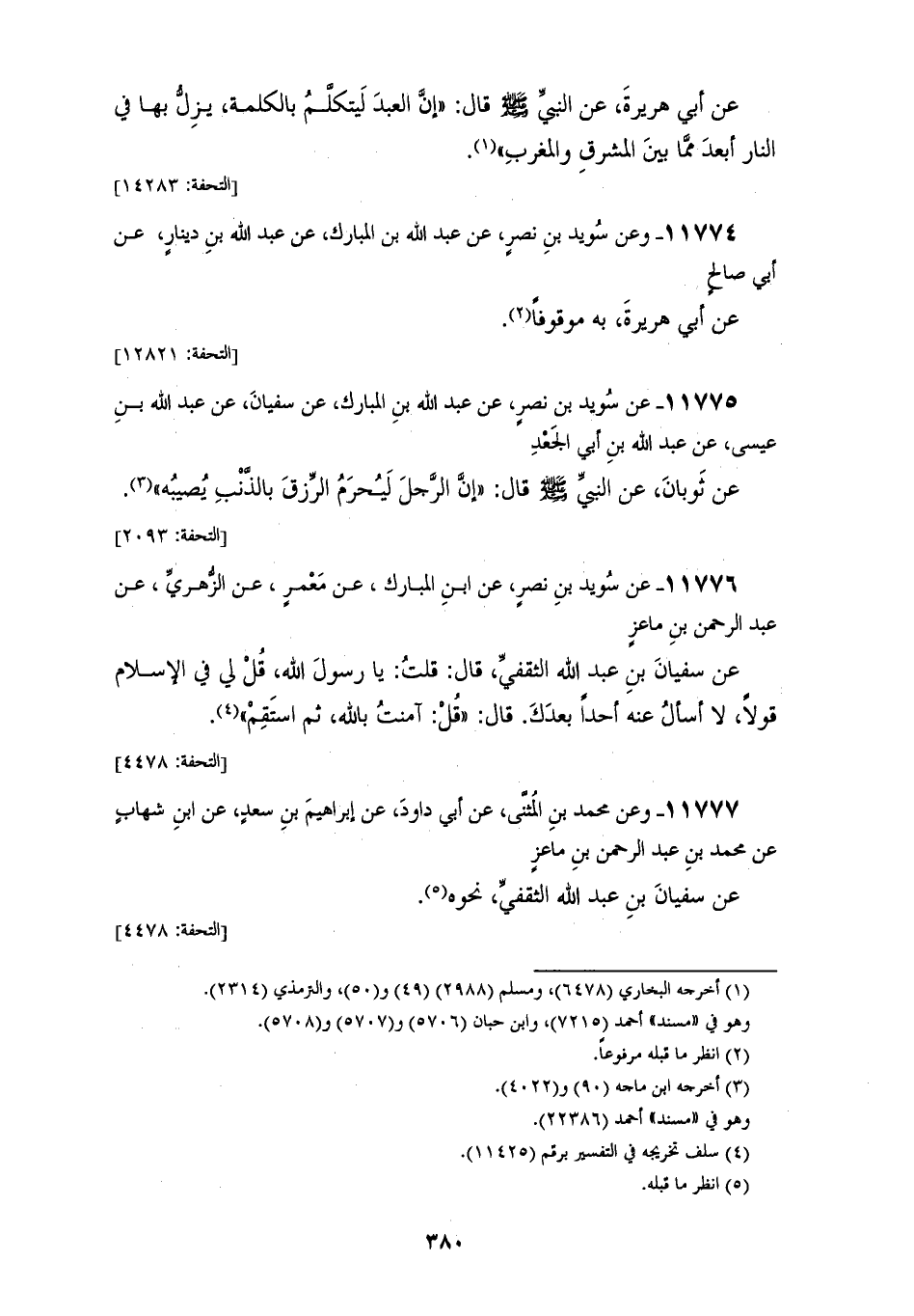 11776 - عَنْ سُوَيْدِ بْنِ نَصْرٍ، عَنِ ابْنِ الْمُبَارَكِ، عَنْ مَعْمَرٍٍ، عَنِ الزُّهْرِيِّ عَنْ عَبْدِ الرَّحْمَنِ بْنِ مَاعِزٍ، عَنْ سُفْيَانَ بْنِ عَبْدِ اللهِ الثَّقَفِيِّ، قَالَ: قُلْتُ: يَا رَسُولَ اللهِ، قُلْ لِي فِي الْإِسْلَامِ قَوْلًا لَا أَسْأَلُ عَنْهُ أَحَدًا بَعْدَكَ، قَالَ: " §قُلْ: آمَنْتُ بِاللهِ، ثُمَّ اسْتَقِمْ "