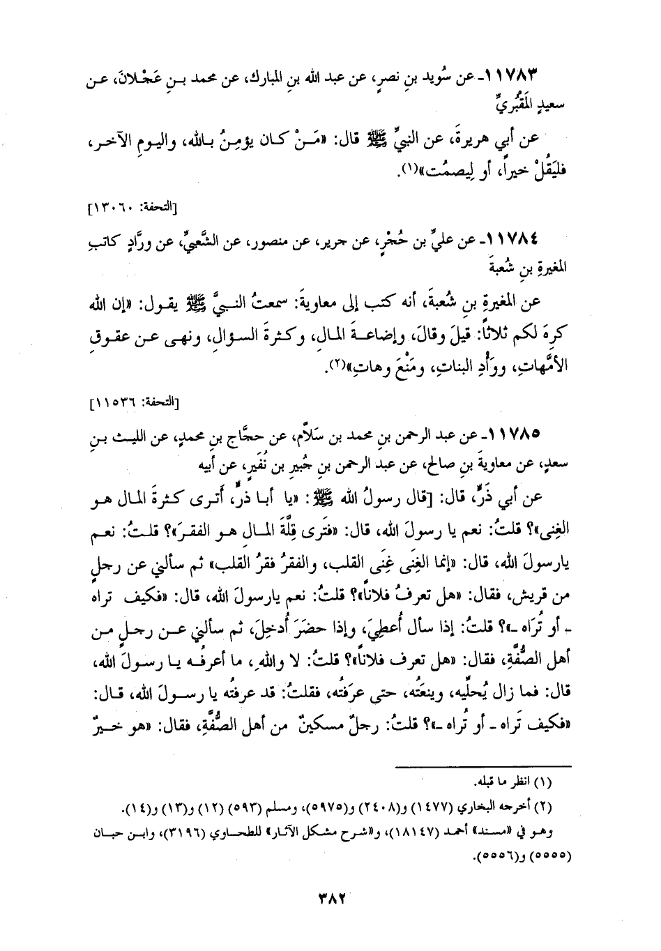 11783 - عَنْ سُوَيْدِ بْنِ نَصْرٍ، عَنْ عَبْدِ اللهِ بْنِ الْمُبَارَكِ، عَنْ مُحَمَّدِ بْن عَجْلَانَ، عَنْ سَعِيدٍ الْمَقْبُرِيِّ، عَنْ أَبِي هُرَيْرَةََََ، عَنِ النَّبِيِّ صَلَّى اللهُ عَلَيْهِ وَسَلَّمَ قَالَ: «§مَنْ كَانَ يُؤْمِنُ بِاللهِ وَالْيَوْمِ الْآخَرِ، فَلْيَقُلْ خَيْرًا أَوْ لِيَصْمُتْ»