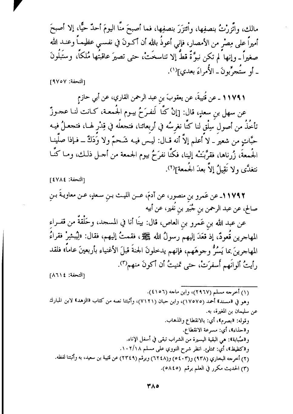 11792 - عَنْ عَمْرو بْن مَنْصُورٍ، عَنْ آدَمَ، عَنِ اللَّيْثِ بْنِ سَعْدٍ، عَنْ مُعَاوِيَةَ بْنِ صَالِحٍ، عَنْ عَبْدِ الرَّحْمَنِ بْنِ جُبَيْرِ بْنِ نُفَيْرٍ، عَنْ أَبِيهِ، عَنْ عَبْدِ اللهِ بْنِ عَمْرو بْنِ الْعَاصِ، قَالَ: بَيْنَا أنَا فِي الْمَسْجِدِ، وَحَلْقَةٌ مِنْ فُقَرَاءِ الْمُهَاجِرِينَ قُعُودٌ، إِذْ قَعَدَ إِلَيْهِمْ رَسُولُ اللهِ صَلَّى اللهُ عَلَيْهِ وَسَلَّمَ، فَقُمْتُ إِلَيْهِمْ، فَقَالَ: «§لِيُبْشِرْ فُقَرَاءُ الْمُهَاجِرِينَ بِمَا يَسُرُّ وُجُوهَهُمْ، فَإِنَّهُمْ يَدْخُلُونَ الْجَنَّةَ قَبْلَ الْأَغْنِيَاءِ بِأَرْبَعِينَ عَامًا» فَلَقَدْ رَأَيْتُ أَلْوَانَهُمْ أَسْفَرَتْ، حَتَّى تَمَنَّيْتُ أَنْ أَكُونَ مِنْهُمْ "