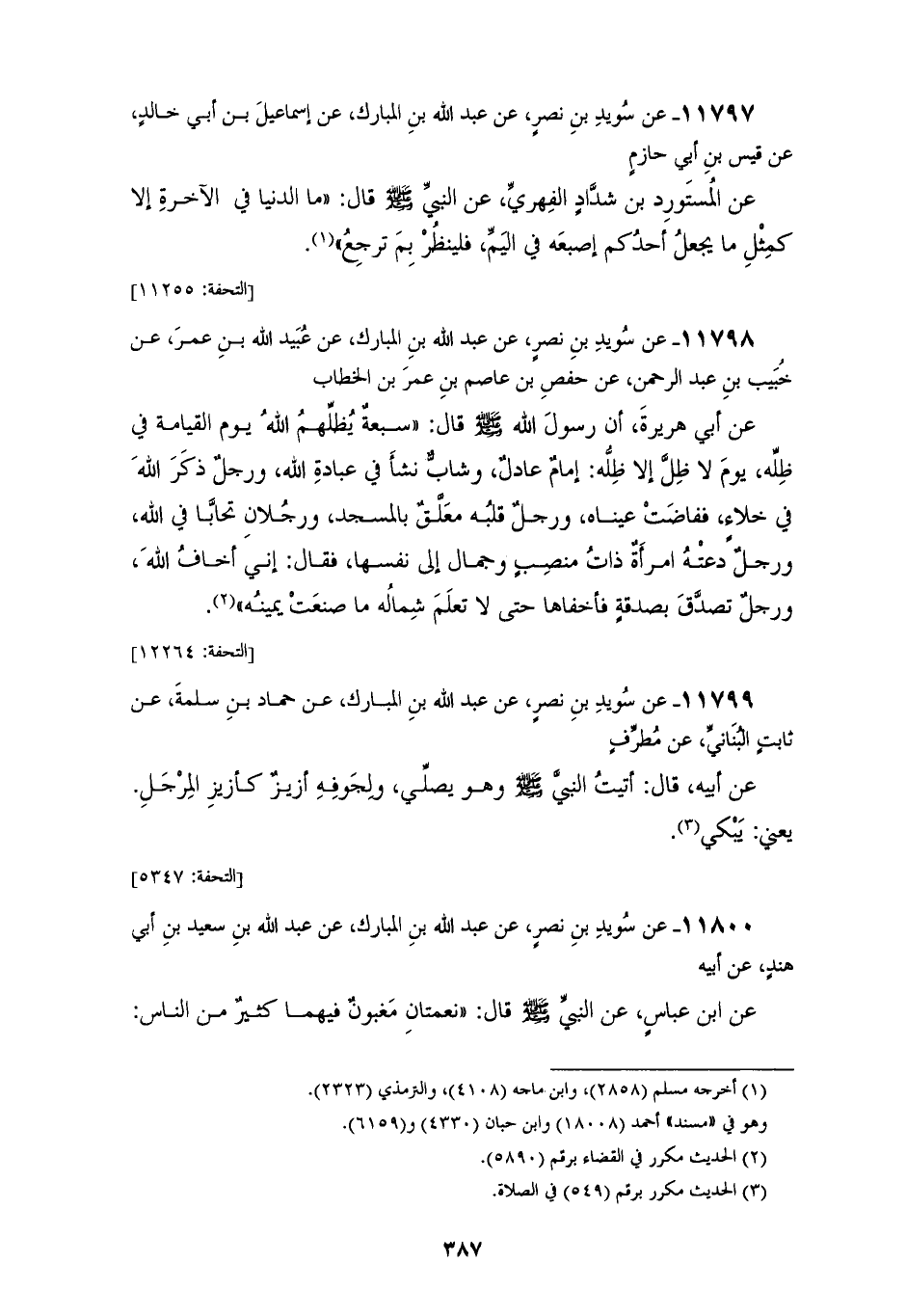 11797 - عَنْ سُوَيْدِ بْنِ نَصْرٍ، عَنْ عَبْدِ اللهِ بْنِ الْمُبَارَكِ، عَنْ إِسْمَاعِيلَ بْنِ أَبِي خَالِدٍ، عَنْ قَيْسِ بْنِ أَبِي حَازِمٍ، عَنِ الْمُسْتَوْرِدِ بْنِ شَدَّادٍ الْفِهْرِيِّ، عَنِ النَّبِيِّ صَلَّى اللهُ عَلَيْهِ وَسَلَّمَ قَالَ: «§مَا الدُّنْيَا فِي الْآخِرَةِ إِلَّا كَمَثَلِ مَا يَجْعَلُ أَحَدُكُمْ إِصْبَعَهُ فِي الْيَمِّ، فَلْيَنْظُرْ بِمَ تَرْجِعُ»