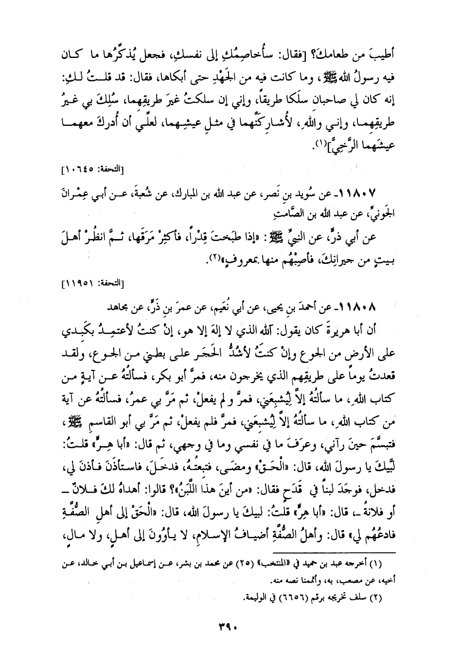11808 - عَنْ أَحْمَدَ بْنِ يَحْيَى، عَنْ أَبِي نُعَيْمٍ، عَنْ عُمَرَ بْنِ ذَرٍّ، عَنْ مُجَاهِدٍ، أَنَّ أَبَا هُرَيْرَةَ، كَانَ يَقُولُ: آللَّهِ الَّذِي لَا إِلَهَ إِلَّا هُوَ، إِنْ كُنْتُ لَأَعْتَمِدُ بِكَبِدِي عَلَى الْأَرْضِ مِنَ الْجُوعِ، وَإِنْ كُنْتُ لَأَشُدُّ الْحَجَرَ عَلَى بَطْنِي مِنَ الْجُوعِ، وَلَقَدْ قَعَدْتُ يَوْمًا عَلَى طَرِيقِهِمُ الَّذِي يَخْرُجُونَ مِنْهُ، فَمَرَّ أَبُو بَكْرٍ، فَسَأَلْتُهُ عَنْ آيَةٍ مِنْ كِتَابِ اللهِ، مَا سَأَلْتُهُ إِلَّا لِيُشْبِعَنِي، فَمَرَّ وَلَمْ يَفْعَل، ثُمَّ مَرَّ بِي عُمَرُ، فَسَأَلْتُهُ عَنْ آيَةٍ مِنْ كِتَابِ اللهِ، مَا سَأَلْتُهُ إِلَّا لِيُشْبِعَنِي، فَمَرَّ فَلَمْ يَفْعَل، ثُمَّ مَرَّ بِي أَبُو الْقَاسِمِ صَلَّى اللهُ عَلَيْهِ وَسَلَّمَ، فَتَبَسَّمَّ حِينَ رَآنِي، وَعَرِفَ مَا فِي نَفْسِي وَمَا فِي وَجْهِي، ثُمَّ قَالَ: «أَبَا هِرٍّ» قُلْتُ: لَبَّيْكَ يَا رَسُولَ اللهِ، قَالَ: «الْحَقْ» وَمَضَى، فَتَبِعْتُهُ، فَدَخَلَ، فَاسْتَأْذَنَ، فَأَذِنَ لِي، فَدَخَلَ، فَوَجَدَ لَبَنًا فِي قَدَحٍ فَقَالَ: «مِنْ أَيْنَ هَذَا اللَّبَنُ؟» قَالَوا: أَهْدَاهُ لَكَ فُلَانٌ - أَوْ فُلَانَةٌ - قَالَ: «أَبَا هِرٍّ» قُلْتُ: لَبَّيْكَ يَا رَسُولَ اللهِ، قَالَ: «§الْحَقْ إِلَى أَهْلِ الصُّفَّةِ فَادْعُهُمْ لِي» قَالَ: وَأَهْلُ الصُّفَّةِ أَضْيَافُ الْإِسْلَامِ، لَا يَأْوُونَ إِلَى أَهْلٍ، وَلَا مَالٍ، وَلَا عَلَى أَحَدٍ، إِذَا أَتَتْهُ صَدَقَةٌ بَعَثَ بِهَا إِلَيْهِمْ، وَلَمْ يَتَنَاوَلْ مِنْهَا شَيْئًا، وَإِذَا أَتَتْهُ هَدِيَّةٌ أَرْسَلَ إِلَيْهِمْ، وَأَصَابَ مِنْهَا وَأَشْرَكَهُمْ فِيهَا، فَسَاءَنِي ذَلِكَ، فَقُلْتُ: وَمَا هَذَا اللَّبَنُ فِي أَهْلِ الصُّفَّةِ؟ كُنْتُ أَحَقَّ أنا أَنْ أُصِيبَ مِنْ هَذَا اللَّبَنِ شَرْبَةً أَتَقَوَّى بِهَا، فَإِذَا جَاءَ أَمَرَنِي، فَكُنْتُ أنا أُعْطِيهِمْ، وَمَا عَسَى أَنْ يَبْلُغْنِي مِنْ هَذَا اللَّبَنِ؟ وَلَمْ يَكُنْ مِنْ طَاعَةِ اللهِ وَطَاعَةِ رَسُولِهِ صَلَّى اللهُ عَلَيْهِ وَسَلَّمَ بُدٌ -[391]-، فَأَتَيْتُهُمْ، فَدَعَوْتُهُمْ، فَأَقْبَلُوا، فَاسْتَأْذَنُوا فَأَذِنَ لَهُمْ، وَأَخَذُوا مَجَالِسَهُمْ مِنَ الْبَيْتِ، قَالَ: «يَا أَبَا هِرٍّ» قُلْتُ: لَبَّيْكَ يَا رَسُولَ اللهِ، قَالَ: «خُذْ فَأَعْطِهِمْ» قَالَ: فَأَخَذْتُ الْقَدَحَ، فَجَعَلْتُ أُعْطِيهِ الرَّجُلَ، فَيَشْرَبَ حَتَّى يُرْوَى، ثُمَّ يَرُدُّ عَلِيَّ الْقَدَحَ، فَأُعْطِيهِ الرَّجُلَ، فَيَشْرَبَ حَتَّى يُرْوَى، ثُمَّ يَرُدُّ عَلِيَّ الْقَدَحَ، فَيَشْرَبَ حَتَّى يُرْوَى، ثُمَّ يَرُدُّ عَلِيَّ الْقَدَحَ، حَتَّى انْتَهَيْتُ إِلَى النَّبِيِّ صَلَّى اللهُ عَلَيْهِ وَسَلَّمَ وَقَدْ رُوِي الْقَوْمُ كُلُّهُمْ، فَأَخَذَ الْقَدَحَ فَوَضَعَهُ عَلَى يَدِهِ، فَنَظَرَ إِلَيَّ فَتَبَسَّمَ، فَقَالَ: «أَبَا هِرٍّ» قُلْتُ: لَبَّيْكَ يَا رَسُولَ اللهِ، قَالَ: «بَقِيَتُ أنا وَأَنْتَ» قُلْتُ: صَدَقْتَ يَا رَسُولَ اللهِ، قَالَ: «اقْعُدْ فَاشْرَبْ»، فَقَعَدْتُ فَشَرِبْتُ، فَقَالَ: «اشْرَبْ» فَشَرِبْتُ، فَمَا زَالَ يَقُولُ: «اشْرَبْ» حَتَّى قُلْتُ: لَا وَالَّذِي بَعَثَكَ بِالْحَقِّ، مَا أَجِدُ لَهُ مَسْلَكًا قَالَ: «فَأَرِنِي» فَأَعْطَيْتُهُ الْقَدَحَ، فَحَمِد اللهَ وَسَمَّى، وَشُرْبَ الْفَضْلَةَ