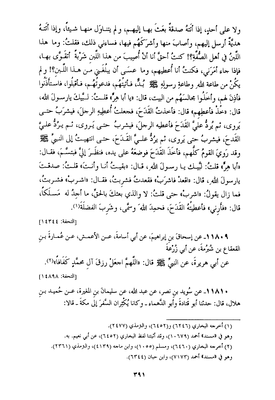 11809 - عَنْ إِسْحَاقَ بْنِ إِبْرَاهِيمَ، عَنْ أَبِي أُسَامَةَ، عَنِ الْأَعْمَشِ، عَنْ عُمَارَةَ بْنِ الْقَعْقَاعِ بْنِ شُبْرُمَةَ، عَنْ أَبِي زُرْعَةَ، عَنْ أَبِي هُرَيْرَةَ، عَنِ النَّبِيِّ صَلَّى اللهُ عَلَيْهِ وَسَلَّمَ قَالَ: «§اللهُمَّ اجْعَلْ رِزْقَ آلِ مُحَمَّدٍ كَفَافًا»