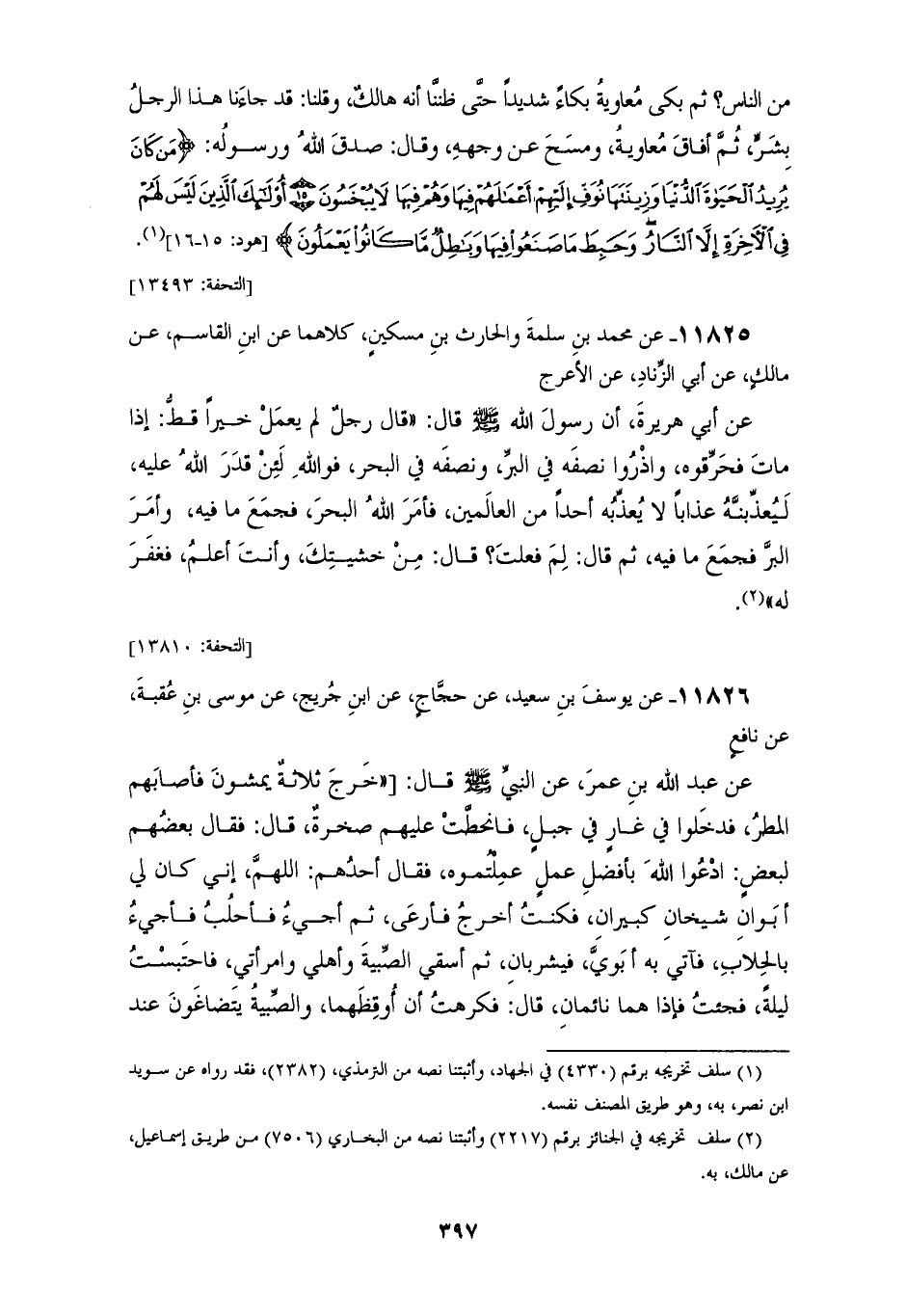11825 - عَنْ مُحَمَّدِ بْنِ سَلَمَةَ، وَالْحَارِثِ بْنِ مِسْكِينٍ، كِلَاهُمَا عَنِ ابْنِ الْقَاسِمِ، عَنْ مَالِكٍ، عَنْ أَبِي الزِّنَادِ، عَنِ الْأَعْرَجِ، عَنْ أَبِي هُرَيْرَةَ، أَنَّ رَسُولَ اللهِ صَلَّى اللهُ عَلَيْهِ وَسَلَّمَ قَالَ: " §قَالَ رَجُلٌ لَمْ يَعْمَلْ خَيْرًا قَطُّ: إِذَا مَاتَ فَحَرِّقُوهُ، وَاذْرُوا نِصْفَهُ فِي الْبِرِّ، وَنِصْفَهُ فِي الْبَحْرِ، فَوَاللهِ لَئِنْ قَدَرَ اللهُ عَلَيْهِ، لَيُعَذِّبَنَّهُ عَذَابًا لَا يُعَذِّبُهُ أَحَدًا مِنَ الْعَالَمِينَ، فَأَمَرَ اللهُ الْبَحْرَ، فَجَمَعَ مَا فِيهِ، وَأَمَرَ الْبِرَّ فَجَمَعَ مَا فِيهِ، ثُمَّ قَالَ: لِمَ فَعَلْتَ؟ قَالَ: مِنْ خَشْيَتِكَ، وَأَنْتَ أَعْلَمُ، فَغَفَرًَ لَهُ "