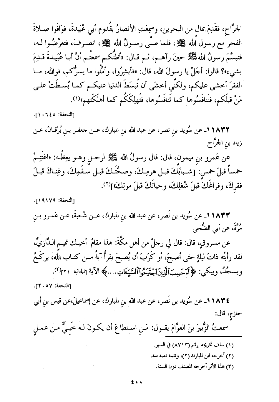 11831 - عَنْ سُوَيْدِ بْنِ نَصْرٍ، عَنِ ابْنِ الْمُبَارَكِ، عَنْ مَعْمَرٍ، وَيُونُسَ، عَنِ الزُّهْرِيِّ، عَنْ عُرْوَةَ بْنِ الزُّبَيْرِ، عَنِ الْمِسْوَرِ بْنِ مَخْرَمَةَ، عَنْ عَمْرو بْنِ عَوْفٍ الْأَنْصَارِيِّ، أَنَّ رَسُولَ اللهِ صَلَّى اللهُ عَلَيْهِ وَسَلَّمَ بَعَثَ أَبَا عُبَيْدَةَ بْنِ الْجَرَّاحِ، فَقَدِمَ بِمَالٍ مِنَ الْبَحْرَيْنِ، وَسَمِعْتُ الْأَنْصَارََََُ بِقُدُومِ أَبِي عُبَيْدَةَ، فَوَافَوْا صَلَاةَ الْفَجْرِ مَعَ رَسُولِ اللهِ صَلَّى اللهُ عَلَيْهِ وَسَلَّمَ، فَلَمَّا صَلَّى رَسُولُ اللهِ صَلَّى اللهُ عَلَيْهِ وَسَلَّمَ، انْصَرَفَ، فَتَعَرَّضُوا لَهُ، فَتَبَسَّمَ رَسُولُ اللهِ صَلَّى اللهُ عَلَيْهِ وَسَلَّمَ حِينَ رَآهُمْ، ثُمَّ قَالَ: «أَظُنُّكُمْ سَمِعْتُمْ أَنَّ أَبَا عُبَيْدَةَ قَدِمَ بِشَيْءٍ؟» قَالَوا: أَجَلْ يَا رَسُولَ اللهِ، قَالَ: «§فَأَبْشِرُوا، وَأَمِّلُوا مَا يَسُرُّكُمْ، فَوَاللهِ مَا الْفَقْرَ أَخْشَى عَلَيْكُمْ، وَلَكِنِّي أَخْشَى أَنْ تُبْسَطَ الدُّنْيَا عَلَيْكُمْ كَمَا بُسِطَتْ عَلَى مَنْ قَبْلَكُم، فَتَنَافَسُوهَا كَمَا تَنَافَسُوهَا، فَتُهْلِكَكُمْ كَمَا أَهْلَكَتْهُمْ»
