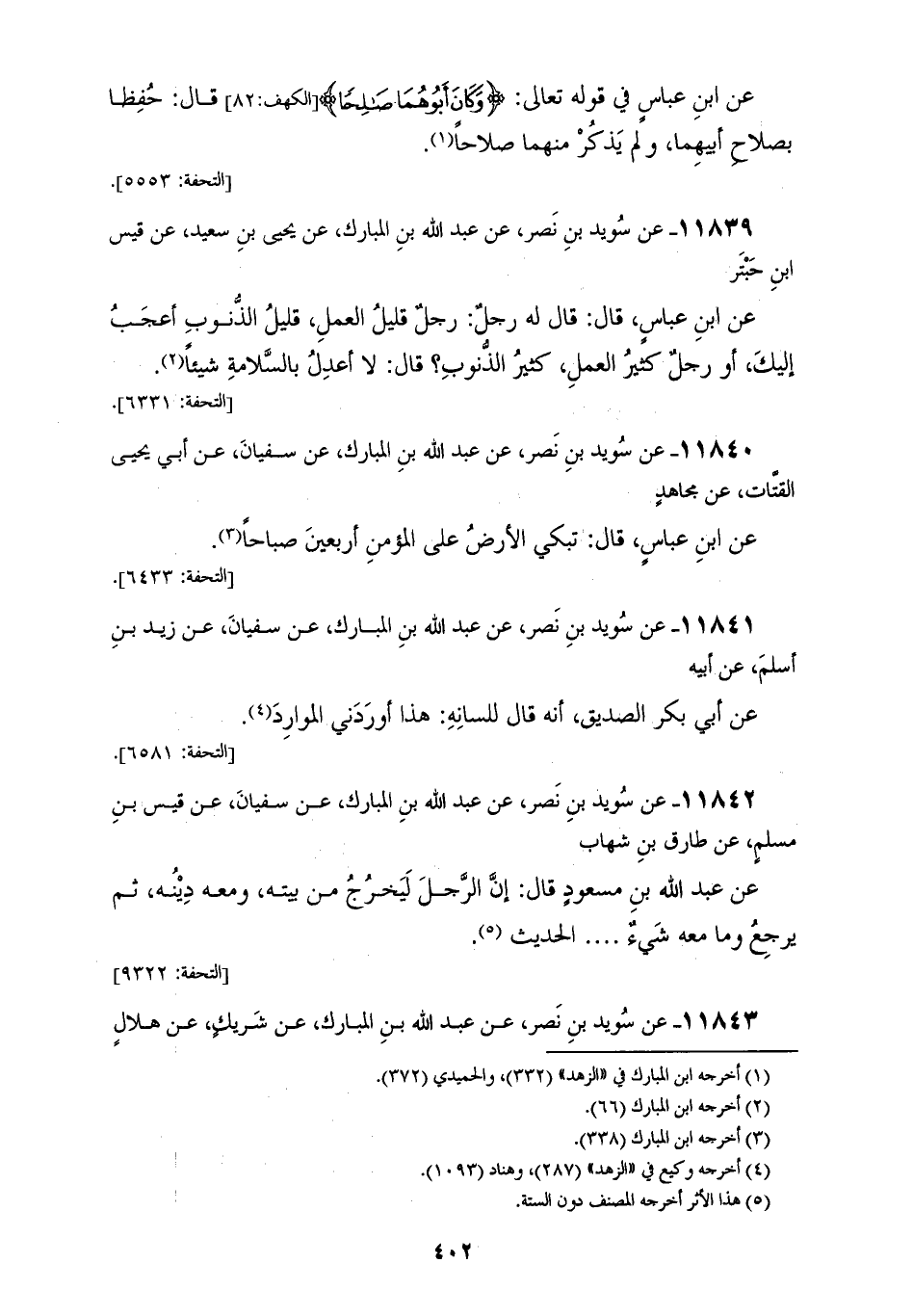 11842 - عَنْ سُوَيْدِ بْنِ نَصْرٍ، عَنْ عَبْدِ اللهِ بْنِ الْمُبَارَكِ، عَنْ سُفْيَانَ، عَنْ قَيْسِ بْنِ مُسْلِمٍ، عَنْ طَارِقِ بْنِ شِهَابٍ، عَنْ عَبْدِ اللهِ بْنِ مَسْعُودٍ، قَالَ: «إِنَّ §الرَّجُلَ لَيَخْرُجُ مِنْ بَيْتِهِ، وَمَعَهُ دِينُهُ، ثُمَّ يَرْجِعُ وَمَا مَعَهُ شَيْءٌ». . . . الْحَدِيثَ