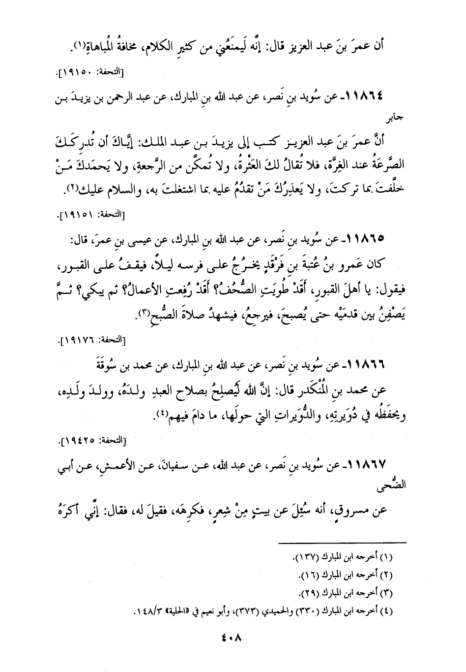 11865 - عَنْ سُوَيْدِ بْنِ نَصْرٍ، عَنْ عَبْدِ اللهِ بْنِ الْمُبَارَكِ، عَنْ عِيسَى بْنِ عُمَرَ، قَالَ: " كَانَ عَمْرو بْنُ عُتْبَةَ بْنِ فَرْقَدٍ يَخْرُجُ عَلَى فَرَسِهِ لَيْلًا، فَيَقِفُ عَلَى الْقُبُورِ، فَيَقُولُ: يَا §أَهْلَ الْقُبُورِ، أَقَدْ طُوِيَتِ الصُّحُفُ؟ أَقَدْ رُفِعَتِ الْأَعْمَالُ؟ ثُمَّ يَبْكِي، ثُمَّ يُصْفِنُ بَيْن قَدَمَيْهِ حَتَّى يُصْبِحَ، فَيَرْجِعَ فَيَشْهَدَ صَلَاةَ الصُّبْحِ "