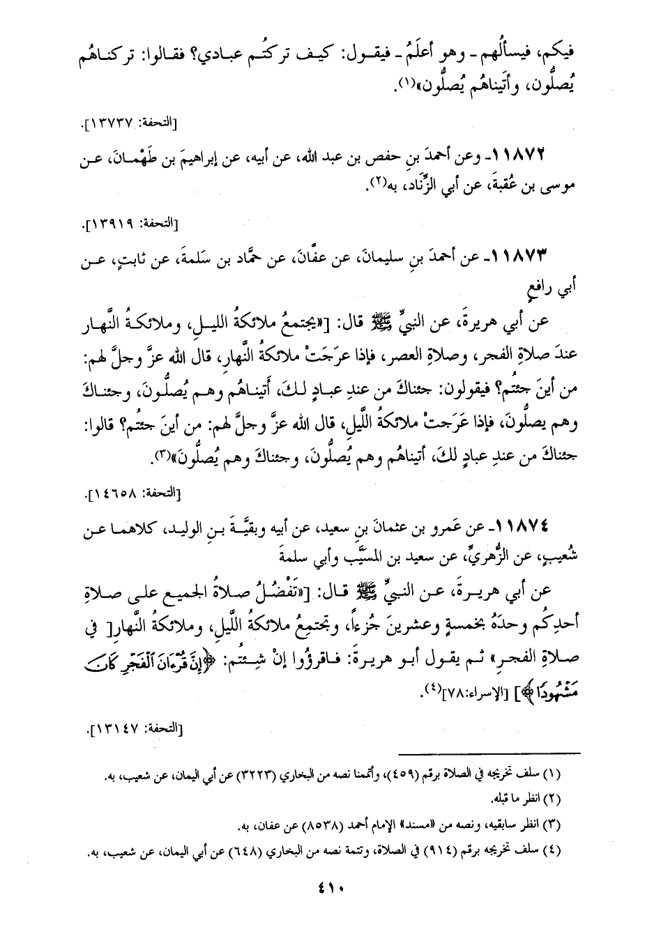 11874 - عَنْ عَمْرو بْنِ عُثْمَانَ بْنِ سَعِيدٍ، عَنْ أَبِيهِ، وَبَقِيَّةَ بْنِ الْوَلِيدِ، كِلَاهُمَا عَنْ شُعَيْبٍ، عَنِ الزُّهْرِيِّ، عَنْ سَعِيدِ بْنِ الْمُسَيِّبِ، وَأَبِي سَلَمَةَ، عَنْ أَبِي هُرَيْرَةَ، عَنِ النَّبِيِّ صَلَّى اللهُ عَلَيْهِ وَسَلَّمَ قَالَ: «§تَفْضُلُ صَلَاةُ الْجَمِيعِ عَلَى صَلَاةِ أَحَدُكُمْ وَحْدَهُ بِخَمْسَةِ وَعِشْرِينَ جُزْءًا، وَتَجْتَمِعُ مَلَائِكَةُ اللَّيْلِ، وَمَلَائِكَةُ النَّهَارِ فِي صَلَاةِ الْفَجْرِ» -[411]- ثُمَّ يَقُولُ أَبُو هُرَيْرَةَ: فَاقْرَءُوا إِنْ شِئْتُمْ: {إِنَّ قُرْآنَ الْفَجْرِ كَانَ مَشْهُودًا} [الإسراء: 78]