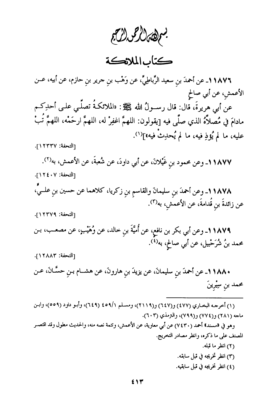 11876 - عَنْ أَحْمَدَ بْنِ سَعِيدٍ الرِّبَاطِيِّ، عَنْ وَهْبِ بْنِ جَرِيرِ بْنِ حَازِمٍ، عَنْ أَبِيهِ، عَنِ الْأَعْمَشِ، عَنْ أَبِي صَالِحٍ، عَنْ أَبِي هُرَيْرَةَ، قَالَ: قَالَ رَسُولُ اللهِ صَلَّى اللهُ عَلَيْهِ وَسَلَّمَ: " §الْمَلَائِكَةُ تُصَلِّي عَلَى أَحَدِكُمْ مَادَامَ فِي مُصَلَّاهُ الَّذِي صَلَّى فِيهِ، يَقُولُونَ: اللهُمَّ اغْفِرْ لَهُ، اللهُمَّ ارْحَمْهُ، اللهُمَّ تُبْ عَلَيْهِ، مَا لَمْ يُؤْذِ فِيهِ، مَا لَمْ يُحَدِثْ فِيهِ "