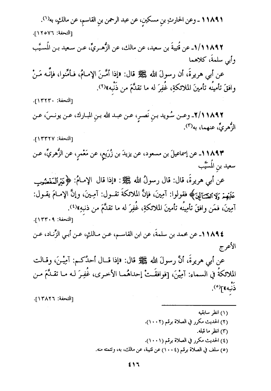 11892 - عَنْ قُتَيْبَةَ بْنِ سَعِيدٍ، عَنْ مَالِكٍ، عَنْ الزُّهْرِي، عَنْ سَعِيد بْن الْمُسَيِّب، وَأَبِي سَلَمَة، كِلَاهُمَا، عَنْ أَبِي هُرَيْرَةَ، أَن رَسُول الله صَلَّى اللهُ عَلَيْهِ وَسَلَّمَ قَالَ: «§إِذَا أَمِنْ الْإِمَام، فَأَمِّنُوا، فَإِنَّه مِنْ وَافَق تَأْمِينُه تَأْمِين الْمَلَائِكَة، غَفَر لَه مَا تَقَدَّم مِنْ ذَنْبِه» وَعَنْ سُوَيْدِ بْنِ نَصْرٍ، عَنْ عَبْدِ اللهِ بْنِ الْمُبَارَكِ، عَنْ يُونُس، عَنْ الزُّهْرِي، عَنْهُمَا بِه