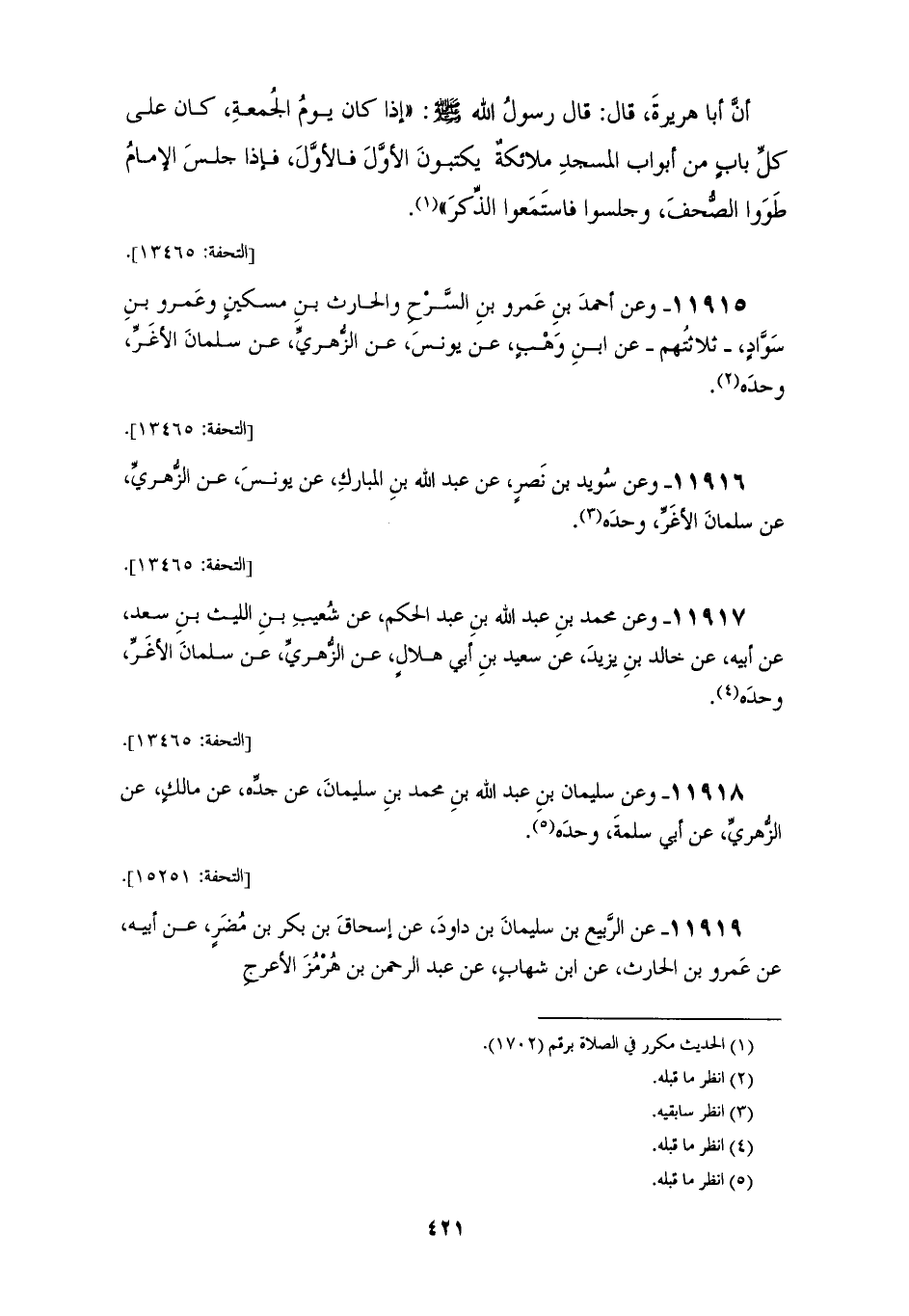 11919 - عَنِ الرَّبِيعِ بْنِ سُلَيْمَانَ بْنِ دَاوُدَ، عَنْ إِسْحَاقَ بْنِ بَكْرِ بْنِ مُضَرَ، عَنْ أَبِيهِ، عَنْ عَمْرو بْنِ الْحَارِثِ، عَنِ ابْنِ شِهَابٍ، عَنْ عَبْدِ الرَّحْمَنِ بْنِ هُرْمُزَ الْأَعْرَجِ، عَنْ أَبِي هُرَيْرَةَ، أَنَّ رَسُولَ اللهِ صَلَّى اللهُ عَلَيْهِ وَسَلَّمَ قَالَ: «§إِذَا كَانَ يَوْمُ الْجُمُعَةِ، كَانَ عَلَى كُل بَابٍ مِنْ أَبْوَابِ الْمَسْجِدِ مَلَائِكَةٌ يَكْتُبُونَ الْأَوَّلَ فَالْأَوَّلَ، فَإِذَا جَلَس الْإِمَامُ، طَوَوُا الصُّحُفَ، وَجَاءُوا يَسْتَمِعُونَ الذِّكْرَ»