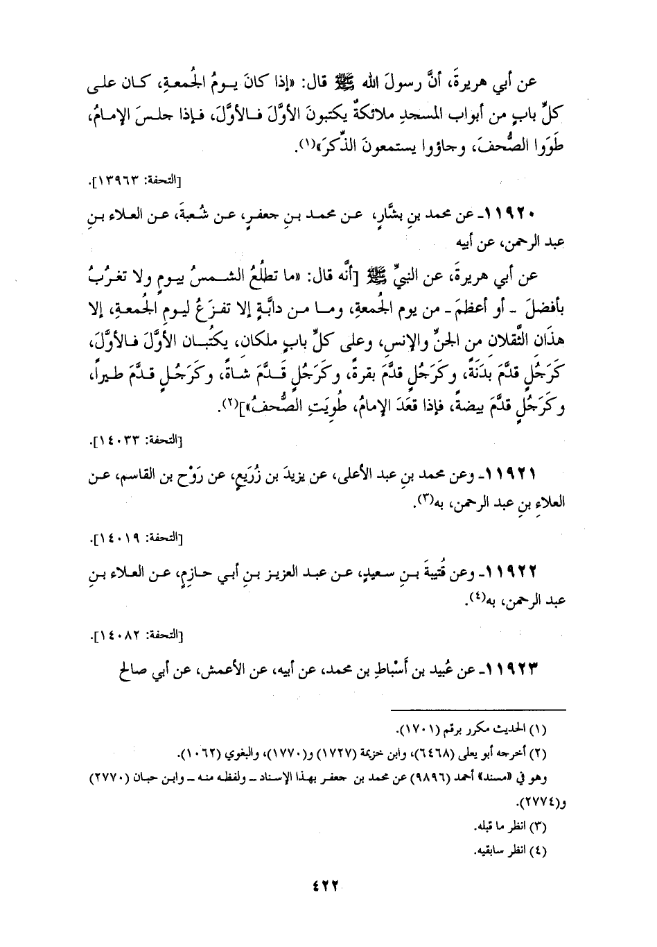 11920 - عَنْ مُحَمَّدِ بْنِ بَشَّارٍ، عَنْ مُحَمَّدِ بْنِ جَعْفَرٍ، عَنْ شُعْبَةَ، عَنِ الْعَلَاءِ بْنِ عَبْدِ الرَّحْمَنِ، عَنْ أَبِيهِ، عَنْ أَبِي هُرَيْرَةَ، عَنِ النَّبِيِّ صَلَّى اللهُ عَلَيْهِ وَسَلَّمَ أَنَّهُ قَالَ: «§مَا تَطْلُعُ الشَّمْسُ بِيَوْمٍ وَلَا تَغْرُبُ بِأَفْضَلَ - أَوْ أَعْظَمَ - مِنْ يَوْمِ الْجُمُعَةِ، وَمَا مِنْ دَابَّةٍ إِلَّا تَفْزَعُ لِيَوْمِ الْجُمُعَةِ، إِلَّا هَذَانِ الثَّقَلَانِ مِنَ الْجِنِّ وَالْإِنْسِ، وَعَلَى كُلِّ بَابٍ مَلَكَانِ يَكْتُبَانِ الْأَوَّلَ فَالْأَوَّلَ، كَرَجُلٍ قَدَّمَ بَدَنَةً، وَكَرَجُلٍ قَدَّمَ بَقَرَةً، وَكَرَجُلٍ قَدَّمَ شَاةً، وَكَرَجُلٍ قَدَّمَ طَيْرًا، وَكَرَجُلٍ قَدَّمَ بَيْضَةً، فَإِذَا قَعَدَ الْإِمَامُ، طُوِيَتِ الصُّحُفُ»