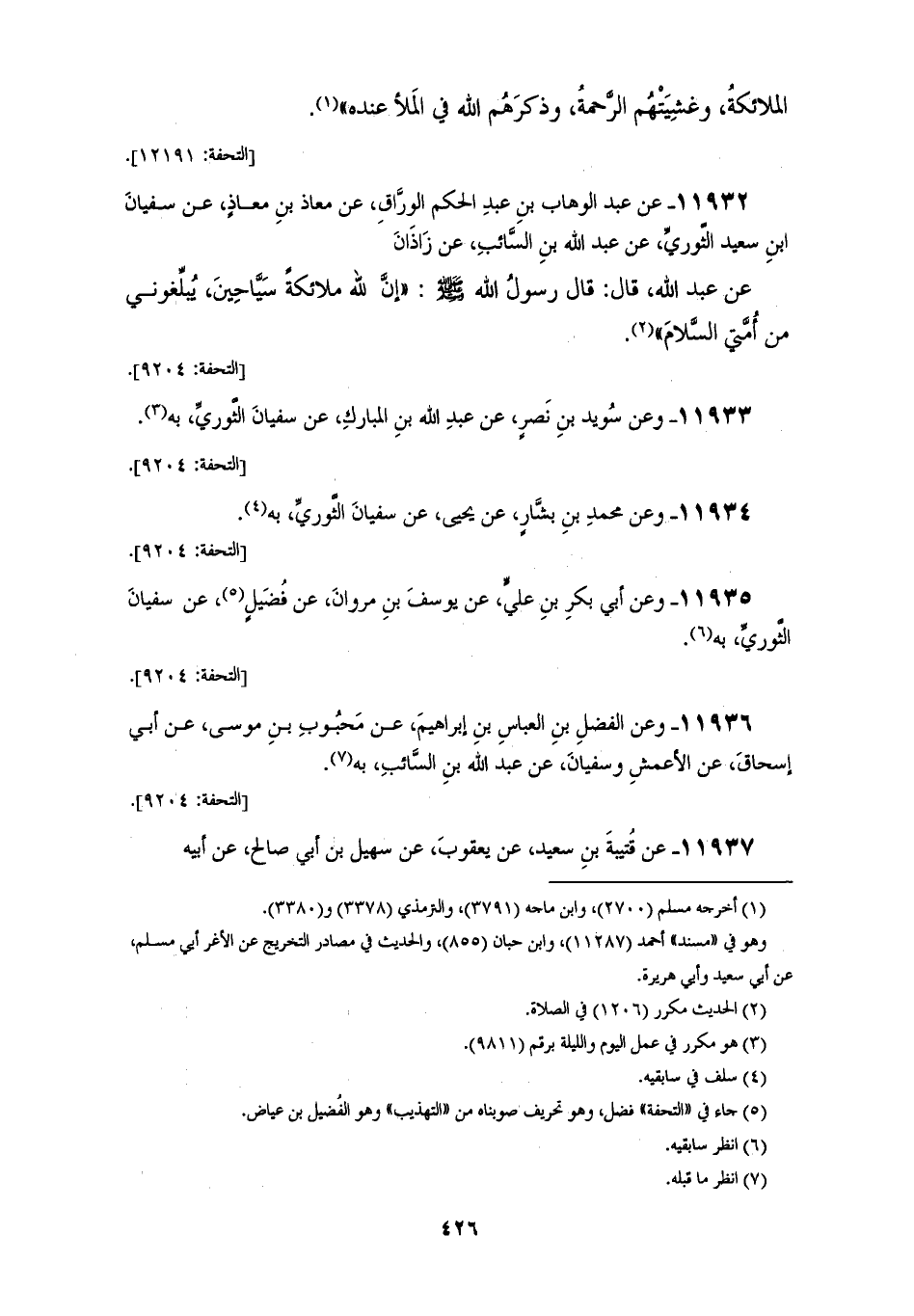 11932 - عَنْ عَبْدِ الْوَهَّابِ بْنِ عَبْدِ الْحَكَمِ الْوَرَّاقِ، عَنْ مُعَاذِ بْنِ مُعَاذِ، عَنْ سُفْيَانَ بْنِ سَعِيدٍ الثَّوْرِيِّ، عَنْ عَبْدِ اللهِ بْنِ السَّائِبِ، عَنْ زَاذَانَ، عَنْ عَبْدِ اللهِ، قَالَ: قَالَ رَسُولُ اللهِ صَلَّى اللهُ عَلَيْهِ وَسَلَّمَ: «إِنَّ §لِلَّهِ مَلَائِكَةً سَيَّاحِينَ، يُبَلِّغُونِي مِنْ أُمَّتِي السَّلَامَ»