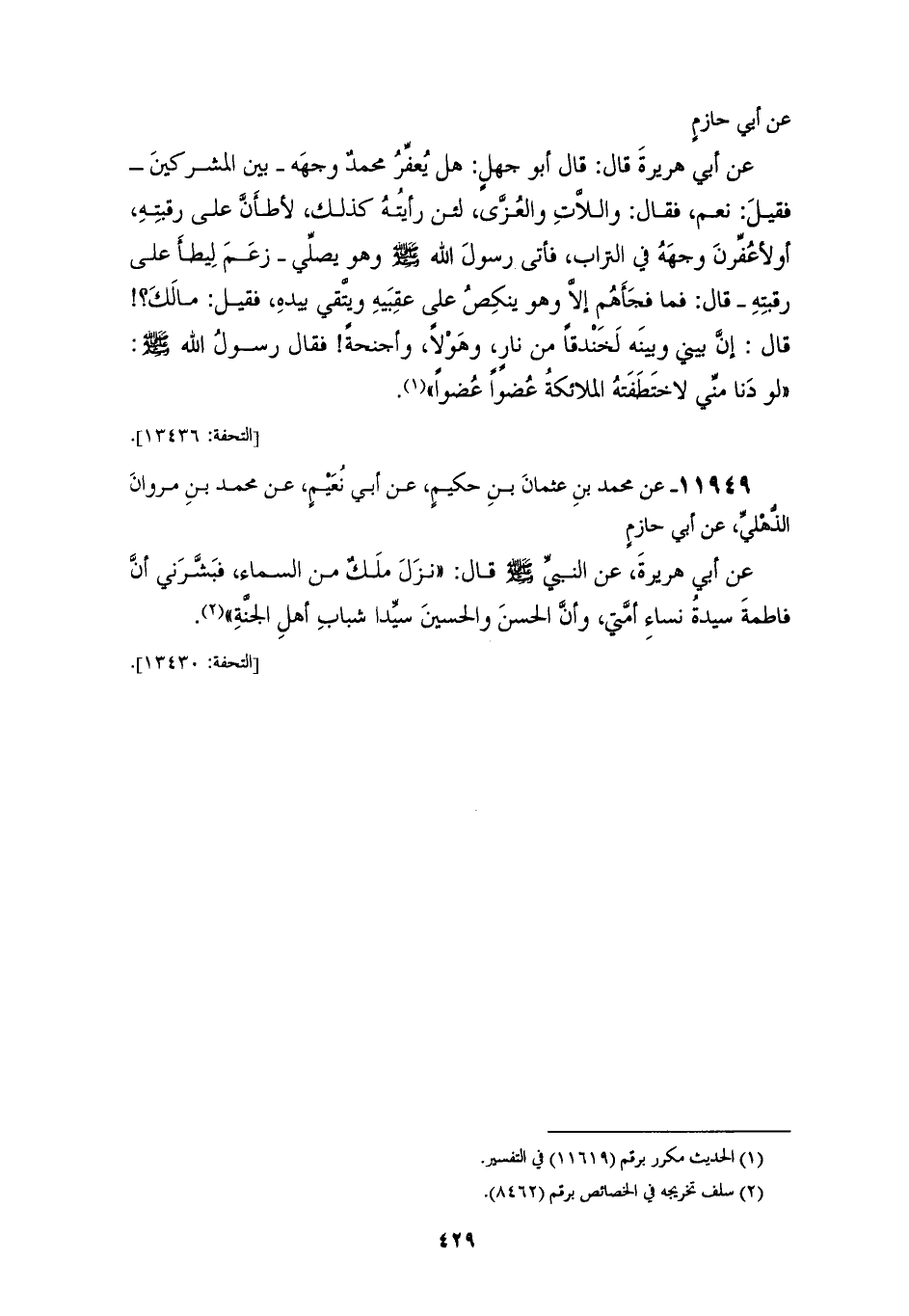 11949 - عَنْ مُحَمَّد بْنِ عُثْمَانَ بْن ِحَكِيمٍ، عَنْ أَبِي نُعَيْمٍ، عَنْ مُحَمَّدِ بْنِ مَرْوَانَ الذُّهْلِيِّ، عَنْ أَبِي حَازِمٍ، عَنْ أَبِي هُرَيْرَةَ، عَنِ النَّبِيِّ صَلَّى اللهُ عَلَيْهِ وَسَلَّمَ قَالَ: «§نَزَلَ مَلَكٌ مِنَ السَّمَاءِ، فَبَشَّرَنِي أَنَّ فَاطِمَةَ سَيِّدَةُ نِسَاءِ أُمَّتِي، وَأَنَّ الْحَسَنَ وَالْحُسَيْنَ سَيِّدَا شَبَابِ أَهْلِ الْجَنَّةِ»