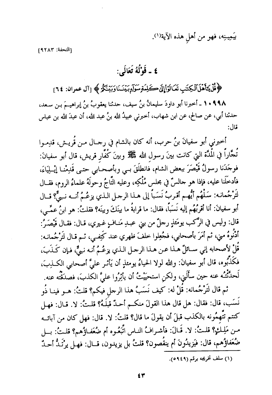 10998 - أَخْبَرَنَا أَبُو دَاوُدَ سُلَيْمَانُ بْنُ سَيْفٍ، حَدَّثَنَا يَعْقُوبُ بْنُ إِبْرَاهِيمَ بْنِ سَعْدٍ، حَدَّثَنَا أَبِي، عَنْ صَالِحٍ، عَنِ ابْنِ شِهَابٍ، أَخبرنِي عُبَيْدُ اللهِ بْنُ عَبْدِ اللهِ: أَنَّ عَبْدَ اللهِ بْنَ عَبَّاسٍ قَالَ: أَخْبَرَنِي أَبُو سُفْيَانَ بْنُ حَرْبٍ، أَنَّهُ كَانَ بِالشَّامِ فِي رِجَالٍ مِنْ قُرَيْشٍ قَدِمُوا تُجَّارًا فِي الْمُدَّةِ الَّتِي كَانَتْ بَيْنَ رَسُولِ اللهِ صَلَّى اللهُ عَلَيْهِ وَسَلَّمَ وَبَيْنَ كُفَّارِ قُرَيْشٍ، قَالَ أَبُو سُفْيَانَ: فَوَجَدْنَا رَسُولَ قَيْصَرَ بِبَعْضِ الشَّامِ، فَانْطَلَقَ بِي وَبِأَصْحَابِي حَتَّى قَدِمْنَا إِيلِيَاءَ، فَأُدْخِلْنَا عَلَيْهِ فَإِذَا هُوَ جَالِسٌ فِي مَجْلِسِ مِلْكِهِ وَعَلَيْهِ التَّاجُ وَحَوْلَهُ عُلَمَاءُ الرُّومِ، فَقَالَ لِتَرْجُمَانِهِ: سَلْهُمْ أَيُّهُمْ أَقْرَبُ نَسَبًا إِلَى هَذَا الرَّجُلِ الَّذِي يَزْعُمُ أَنَّهُ نَبِيٌّ، قَالَ أَبُو سُفْيَانَ: أَنَا أَقْرَبُهُمْ إِلَيْهِ نَسَبًا، فَقَالَ: مَا قَرَابَةُ مَا بَيْنَكَ وَبَيْنَهُ؟ فَقُلْتُ: هُوَ ابْنُ عَمِّي، قَالَ: وَلَيْسَ فِي الرَّكْبِ يَوْمَئِذٍ رَجُلٌ مِنْ بَنِي عَبْدِ مَنَافٍ غَيْرِي، قَالَ: فَقَالَ قَيْصَرُ: أَدْنُوهُ مِنِّي، ثُمَّ أَمَرَ بِأَصْحَابِي فَجُعِلُوا خَلْفَ ظَهْرِي عِنْدَ كَتِفِي، ثُمَّ قَالَ لِتَرْجُمَانِهِ: قُلْ لِأَصْحَابِهِ إِنِّي سَائِلٌ هَذَا عَنْ هَذَا الرَّجُلِ الَّذِي يَزْعُمُ أَنَّهُ نَبِيٌّ، فَإِنْ كَذَبَ فَكَذِّبُوهُ، قَالَ أَبُو سُفْيَانَ: وَاللهِ لَوْلَا الْحَيَاءُ يَوْمَئِذٍ أَنْ يَأْثِرَ عَلَيَّ أَصْحَابِي الْكَذِبَ لَحَدَّثْتُهُ عَنْهُ حِينَ سَأَلَنِي، وَلَكِنِ اسْتَحْيَيْتُ أَنْ يَأْثِرُوا عَلَيَّ الْكَذِبَ فَصَدَقَتُهُ عَنْهُ، ثُمَّ قَالَ لِتَرْجُمَانِهِ: قُلْ لَهُ: كَيْفَ نَسَبُ هَذَا الرَّجُلِ فِيكُمْ؟ قُلْتُ: هُوَ فِينَا ذُو نَسَبٍ، قَالَ: فَقَالَ: هَلْ قَالَ هَذَا الْقَوْلَ مِنْكُمْ أَحَدٌ قَبْلَهُ؟ قُلْتُ: لَا، قَالَ: فَهَلْ كُنْتُمْ تَتَّهِمُونَهُ بِالْكَذِبِ قَبْلَ أَنْ يَقُولَ مَا قَالَ؟ قُلْتُ: لَا، قَالَ: فَهَلْ كَانَ مِنْ آبَائِهِ مَنْ مَلَكَ؟ قُلْتُ: لَا، قَالَ: فَأَشْرَافُ النَّاسِ اتَّبَعُوهُ أَمْ ضُعَفَاؤُهُمْ؟ قُلْتُ: بَلْ ضُعَفَاؤُهُمْ -[44]-، قَالَ: فَيَزِيدُونَ أَمْ يَنْقُصُونَ؟ قُلْتُ: بَلْ يَزِيدُونَ، قَالَ: فَهَلْ يَرْتَدُّ أَحَدٌ سَخْطَةً لِدِينِهِ بَعْدَ أَنْ يَدْخُلَ فِيهِ، قُلْتُ: لَا، قَالَ: فَهَلْ يَغْدِرُ؟ قُلْتُ: لَا، وَنَحْنُ مِنْهُ الْآنَ فِي مُدَّةٍ، وَنَحْنُ نَخَافُ أَنْ يَغْدِرَ، قَالَ أَبُو سُفْيَانَ: وَلَمْ تُمْكِنِّي كَلِمَةٌ أُدْخِلَ فِيهَا شَيْئًا أَنْتَقِصُهُ بِهَا أَخَافَ أَنْ تُؤْثَرَ عَنِّي غَيْرُهَا، قَالَ: فَهَلْ قَاتَلْتُمُوهُ، وَهَلْ قَاتَلَكُمْ؟ فَقُلْتُ: نَعَمْ، قَالَ: فَكَيْفَ كَانَ حَرْبُكُمْ وَحَرْبُهُ؟ قُلْتُ: كَانَتْ دُوَلًا وَسِجَالًا، يُدَالُ عَلَيْنَا الْمَرَّةَ، وَنُدَالُ عَلَيْهِ الْأُخْرَى، قَالَ: فَمَا كَانَ يَأْمُرُكُمْ بِهِ؟ قُلْتُ: " §يَأْمُرُنَا أَنْ نَعْبُدَ اللهَ وَحْدَهُ وَلَا نُشْرِكَ بِهِ شَيْئًا، وَنَهَانَا عَمَّا كَانَ يَعْبُدُ آبَاؤُنَا، وَيَأْمُرُنَا بِالصَّلَاةِ وَالصِّدْقِ وَالْعَفَافِ وَالْوَفَاءِ بِالْعَهْدِ، وَأَدَاءِ الْأَمَانَةِ، فَقَالَ لِتَرْجُمَانِهِ حِينَ قُلْتُ ذَلِكَ: قُلْ لَهُ إِنِّي سَأَلْتُكَ عَنْ نَسَبِهِ فِيكُمْ، فَزَعَمْتَ أَنَّهُ فِيكُمْ ذُو نَسَبٍ، وَكَذَلِكَ الرُّسُلُ تُبْعَثُ فِي نَسَبِ قَوْمِهَا، وَسَأَلْتُكَ هَلْ قَالَ هَذَا الْقَوْلَ أَحَدٌ مِنْكُمْ قَبْلَهُ، فَزَعَمْتَ أَنْ لَا، فَقُلْتُ: أَنْ لَوْ قَالَ هَذَا الْقَوْلَ أَحَدٌ مِنْكُمْ قَبْلَهُ، قُلْتُ: رَجُلٌ يَأْتَمُّ بِقَوْل