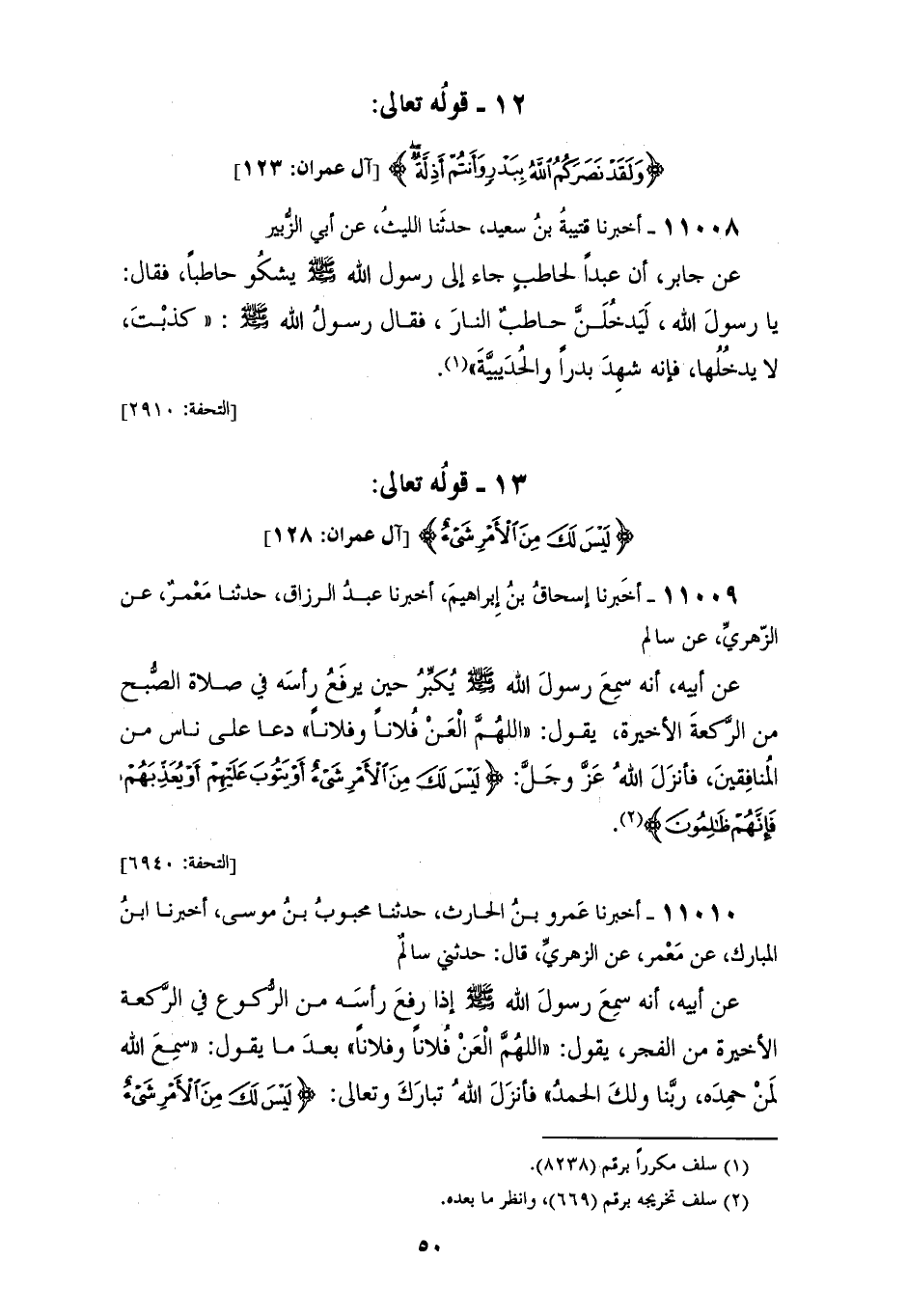 11009 - أَخْبَرَنَا إِسْحَاقُ بْنُ إِبْرَاهِيمَ، أَخْبَرَنَا عَبْدُ الرَّزَّاقِ، حَدَّثَنَا مَعْمَرٌ، عَنِ الزُّهْرِيِّ، عَنْ سَالِمٍ، عَنْ أَبِيهِ أَنَّهُ سَمِعَ رَسُولَ اللهِ صَلَّى اللهُ عَلَيْهِ وَسَلَّمَ يُكَبِّرُ حِينَ يَرْفَعُ رَأْسَهُ فِي صَلَاةِ الصُّبْحِ مِنَ الرَّكْعَةِ الْأَخِيرَةِ يَقُولُ: «§اللهُمَّ الْعَنْ فُلَانًا وَفُلَانًا» دَعَا عَلَى نَاسٍ مِنَ الْمُنَافِقِينَ، فَأَنْزَلَ اللهُ عَزَّ وَجَلَّ {لَيْسَ لَكَ مِنَ الْأَمْرِ شَيْءٌ أَوْ يَتُوبَ عَلَيْهِمْ أَوْ يُعَذِّبَهُمْ فَإِنَّهُمْ ظَالِمُونَ} [آل عمران: 128]